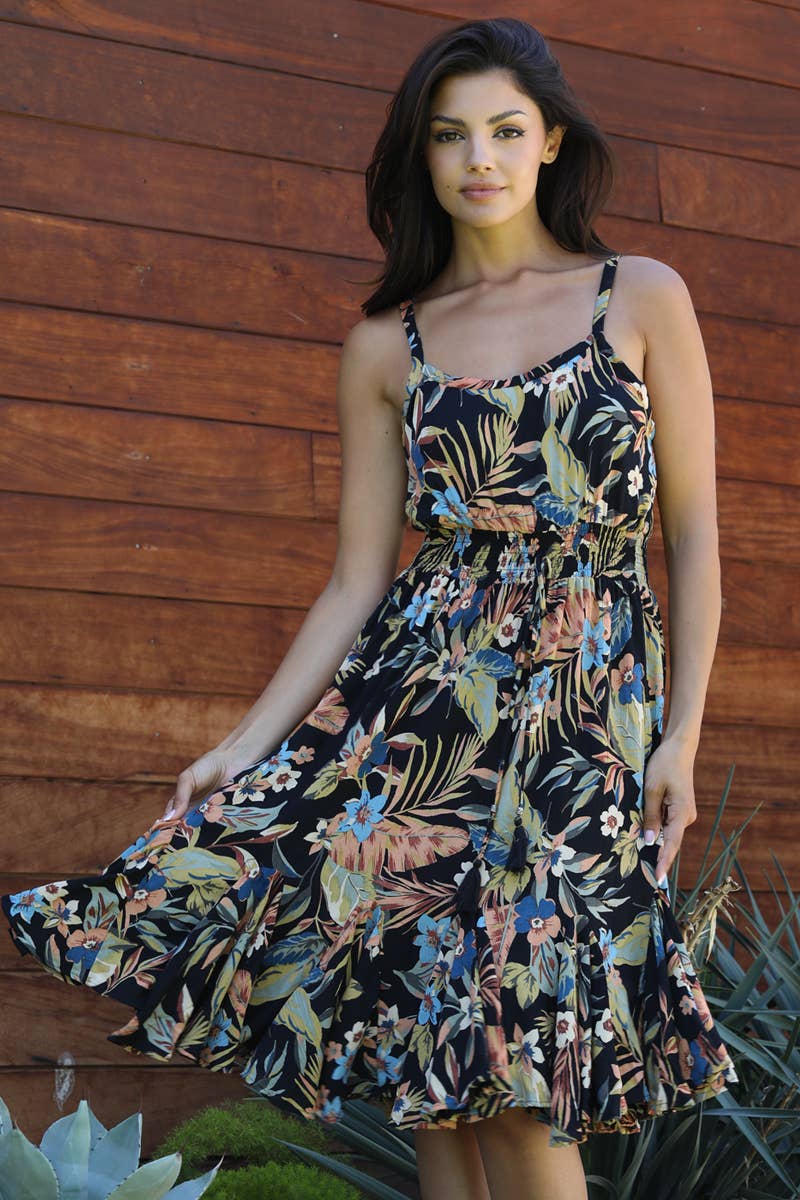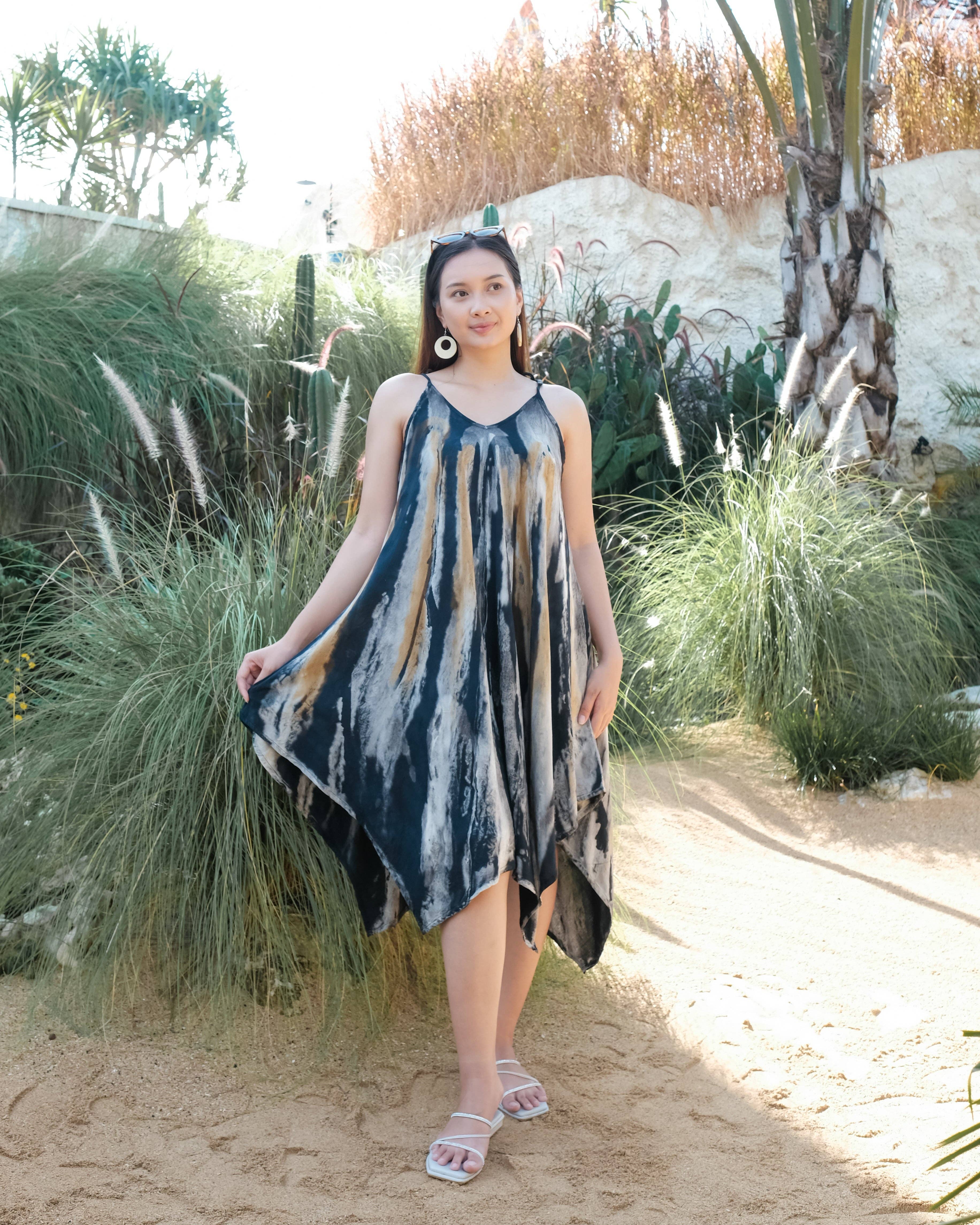 This one size, tie strap dress fits up to 14 comfortably & with its handkerchief hem is so cute. It is so versatile and can be worn to the beach or styled up to go out to dinner. Tie strap is adjustable Wear with or without tee or tank underneath 100% Rayon Wash Cold, Hang to dry Handmade and ethically sourced from Bali. SKU: LS1321BU