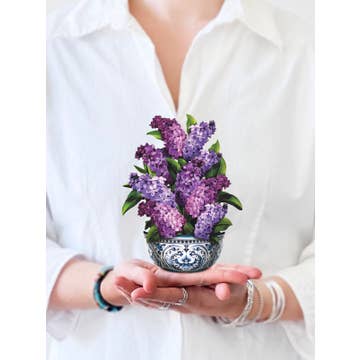 Mini Garden Lilacs (10 Flowers with envelope +notecard). Each pop up flower card includes a small blank coordinating notecard. Discover the beauty of spring with our Mini Garden Lilacs pop-up bouquet. Standing just below 6 inches, this charming display features lush greenery and luminous purple hues, perfect for any setting. Enjoy the elegance of lilacs without the fleeting blooming season or harsh fragrance. Symbolizing love, acceptance, and confidence, this mini bouquet is an ideal gift for any occasion. Elevate your decor with FreshCut Paper's exquisite designs.