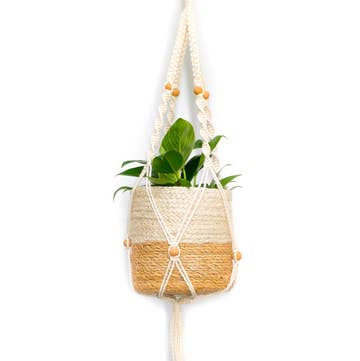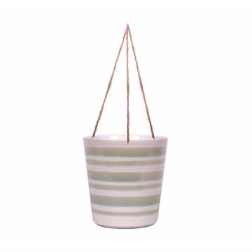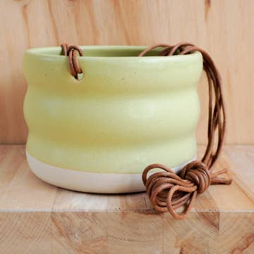 Each planter is thrown on a potter's wheel, trimmed, given holes, and glazed by hand. Smooth, creamy stoneware is left unglazed on the bottom. The bottom of the pot has three drainage holes and the string is waxed cotton. Capacity - 5.5" wide x 4" tall. Dishwasher and Microwave Safe (without string), just in case. All pieces are MADE TO ORDER and will ship in approximately 4-6 weeks. If you need a more accurate timeline or a potential rush order, please reach out. Due to the handmade nature of the wares, slight variation from the one pictured should be expected.