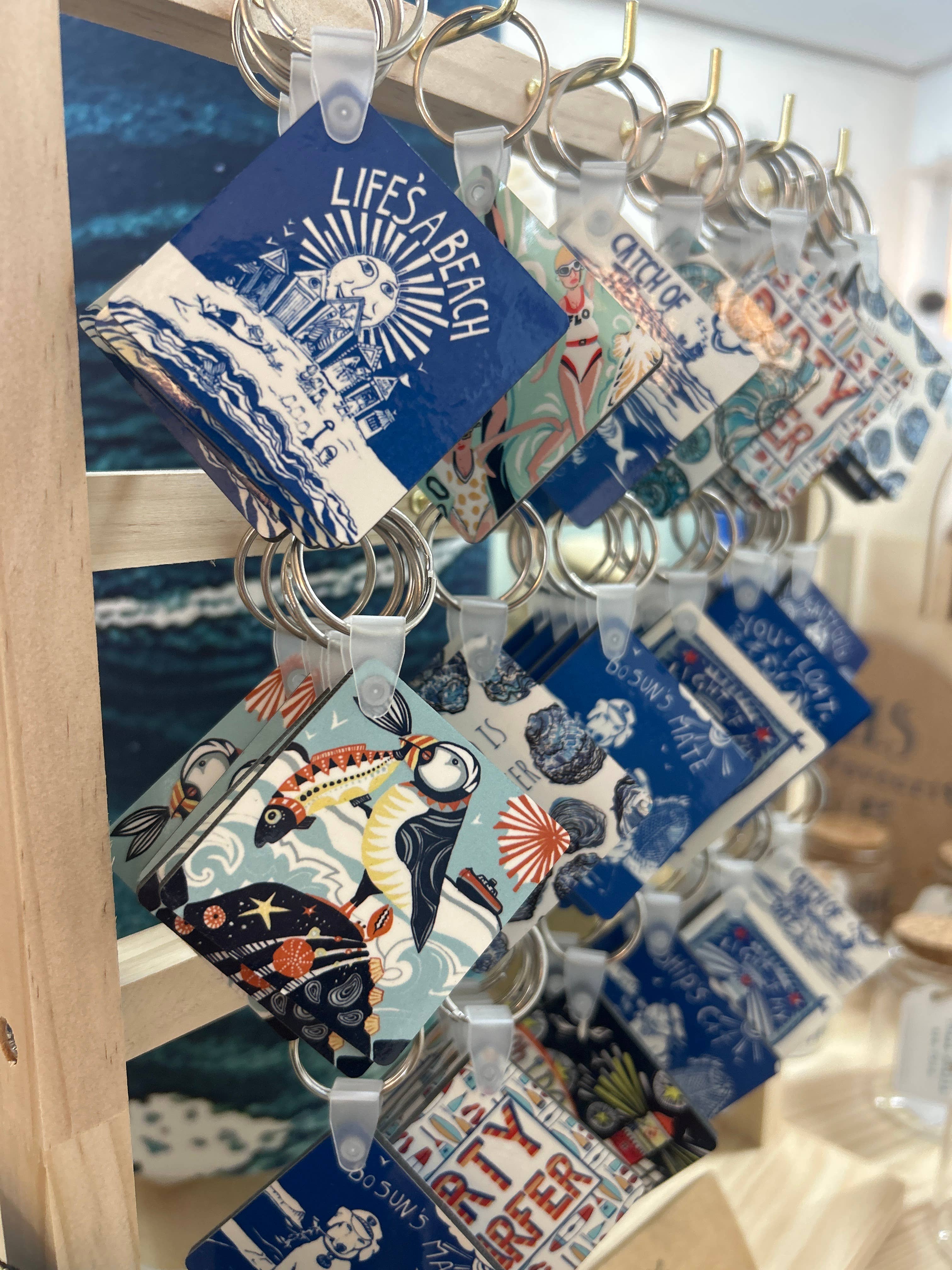 Popular keychains, great coastal designs which fit perfectly in my beach shop. A bit more upscale and different than other generic plastic designs I’ve seen.