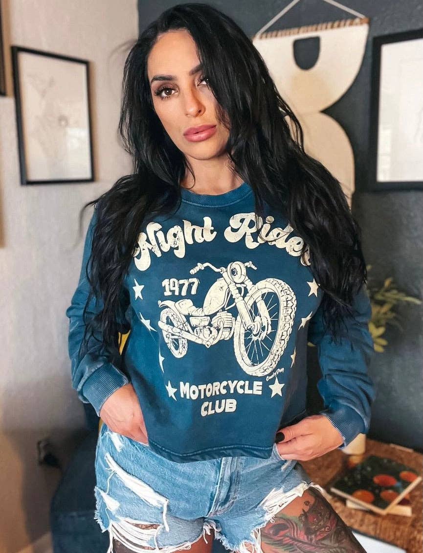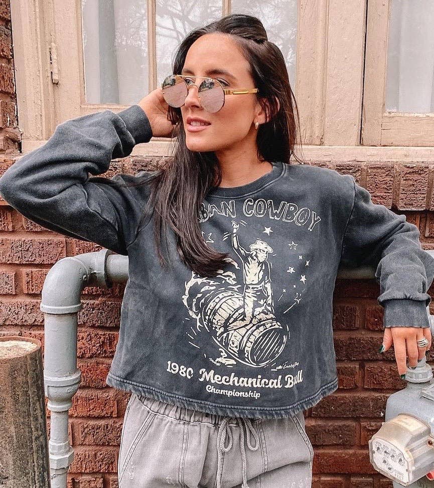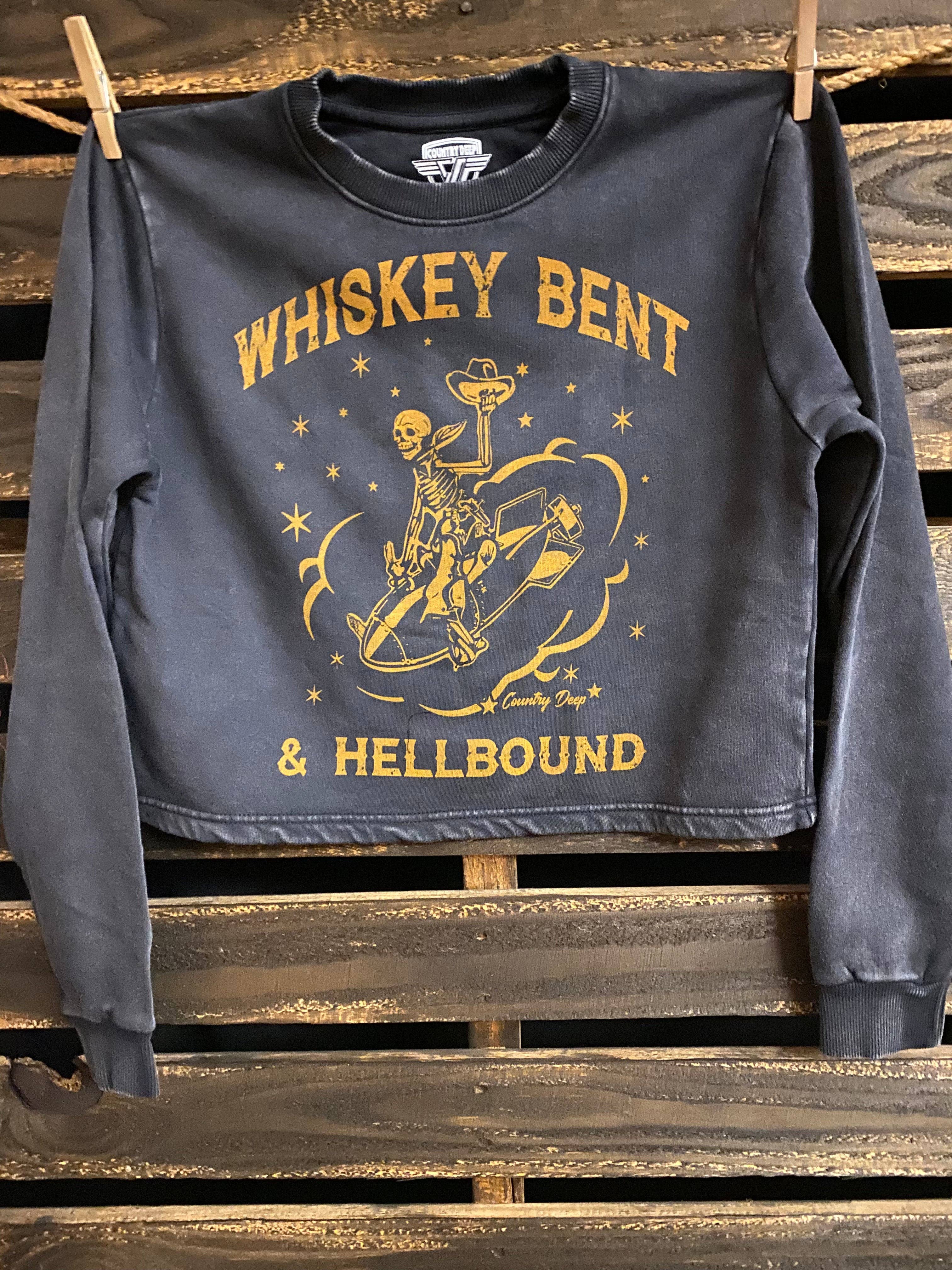 Country Deep Here Comes Trouble crew neck sweatshirt in Acid wash black Acid Wash 6.5 oz, 32 single 52% Airlume combed and ring-spun cotton/48% Side-seamed Raw hem Cropped Body Ribbed cuffs Sizes: S-XL