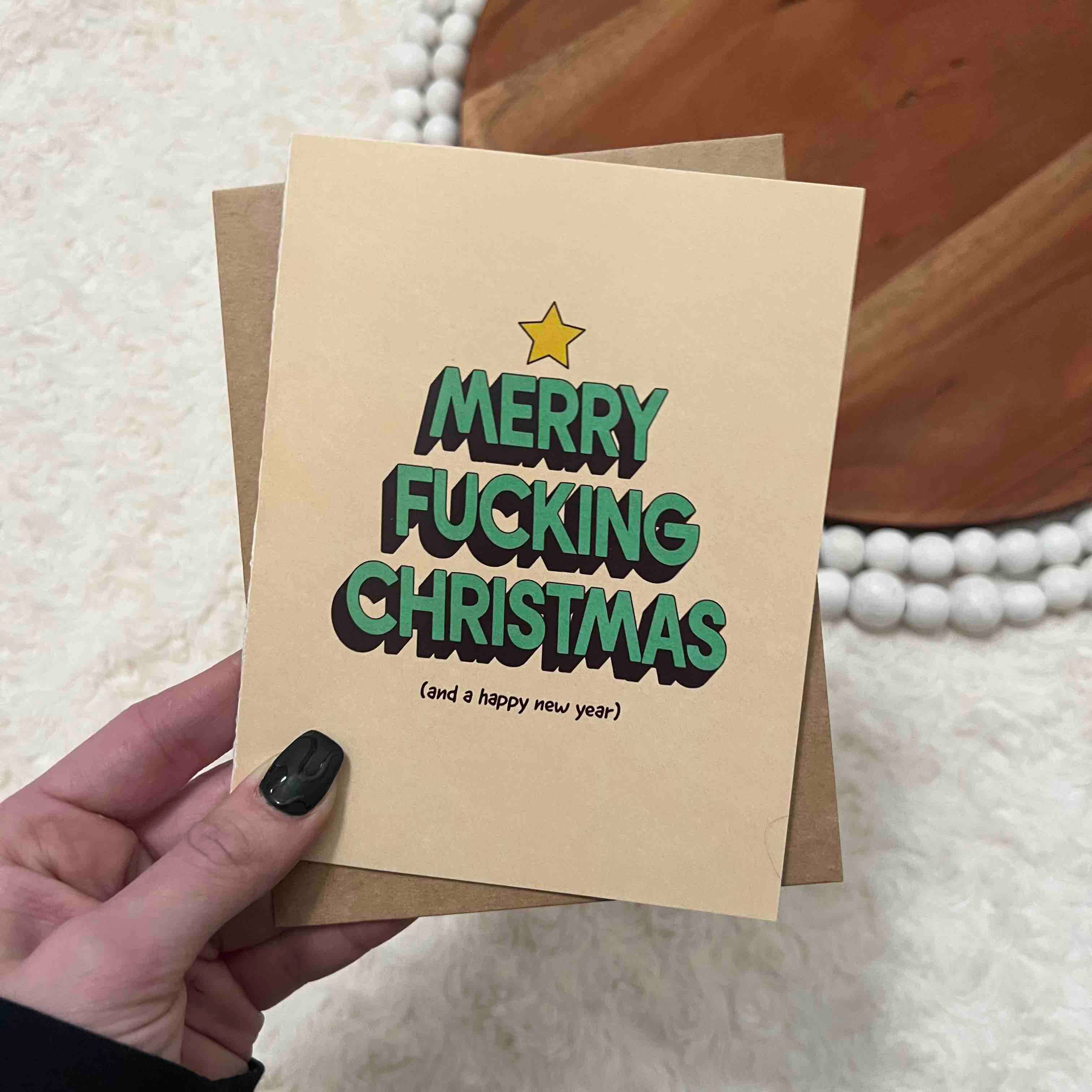 A funny vintage-inspired Christmas greeting card. "Merry AF" Details: • Premium quality, soft touch cardstock • Specialty die cut • Includes an A2 kraft envelope (4-3/8" x 5-3/4") • Blank inside • All cards are individually packaged in a cellophane sleeve 🇺🇸 Each card is printed in the USA.