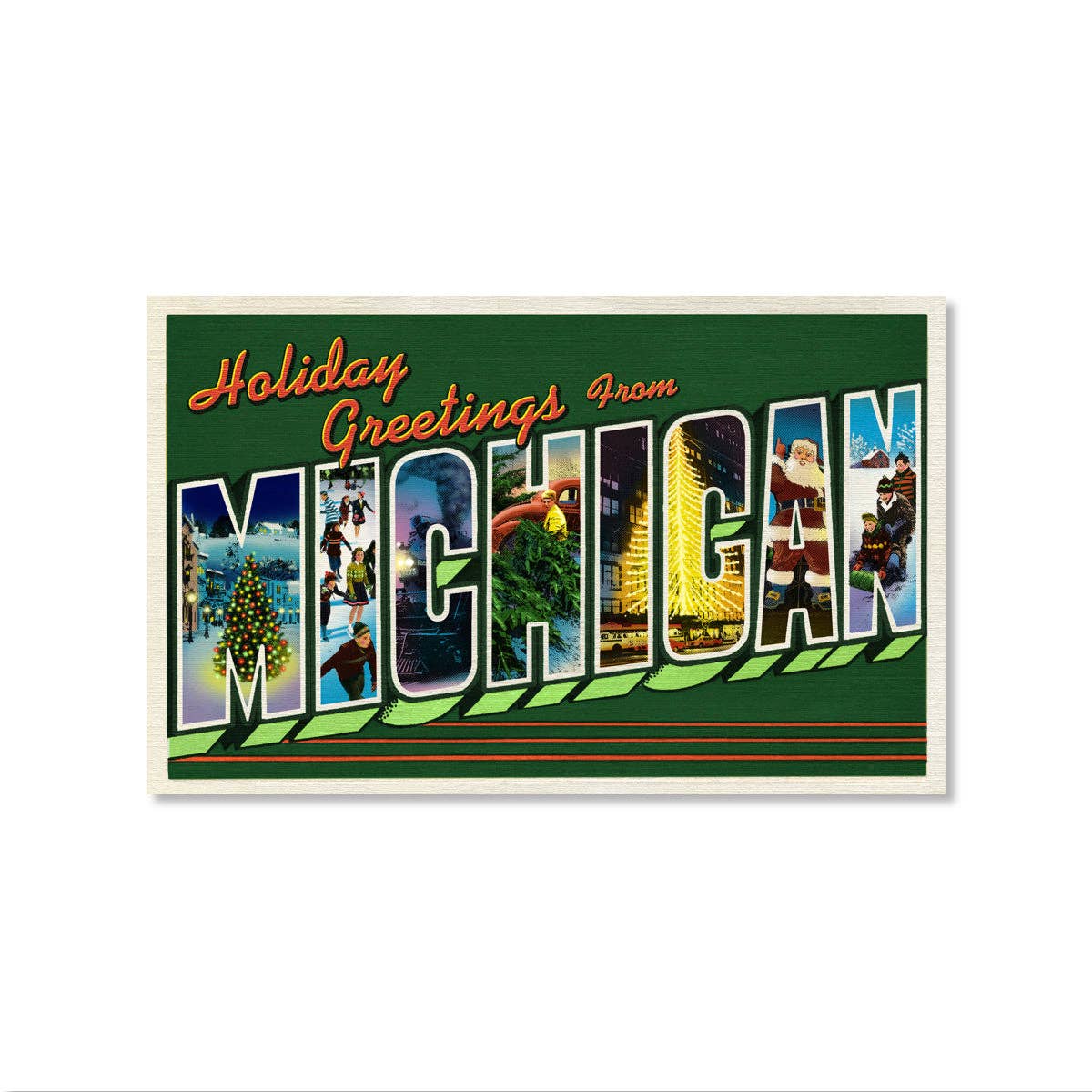 A nostalgic celebration of Christmas in Michigan, this design captures iconic winter and holiday scenes from across the state—including Mackinac Island’s snowy charm, Detroit’s festive spirit, the town of Christmas, and a magical nod to the Polar Express. Presented in a classic “large letter” postcard style with a distinctly Michigan twist, it’s the perfect way to send warm holiday wishes from the Great Lakes State. Each card measures 2-3/4" x 4", is printed double-sided on 12-point C1S paper stock, features “To” and “From” on the back for personalization, and includes a matching white envelope. Sets of six Packaged in a clear bag with a hang hole and measuring 3-1/2” x 7”, these sets are ready for easy retail display. Single cards Individually wrapped in clear bags, ideal for impulse buys at checkout. Perfect for customers who love vintage-inspired designs, Michigan-themed greetings, or want a holiday card that shares the season’s charm with friends and family near and far.