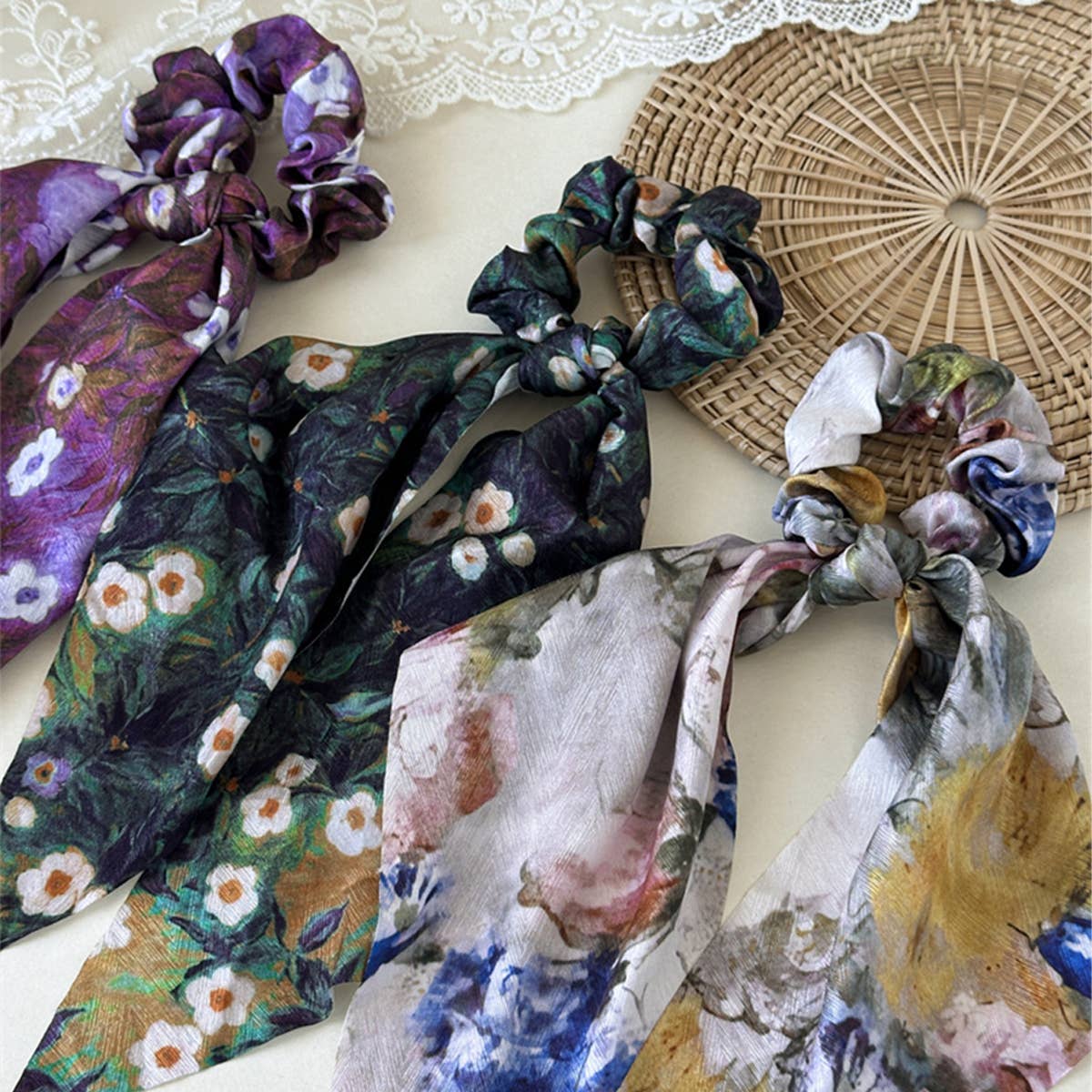 Wholesale Boho Oversized Silk Floral Hair Scrunchies, Hippie Bohemian