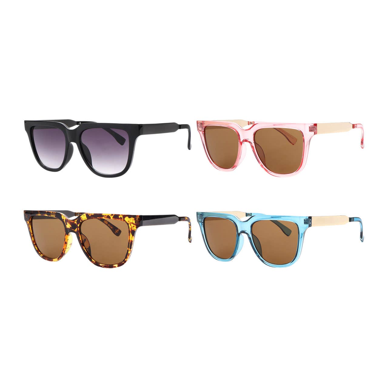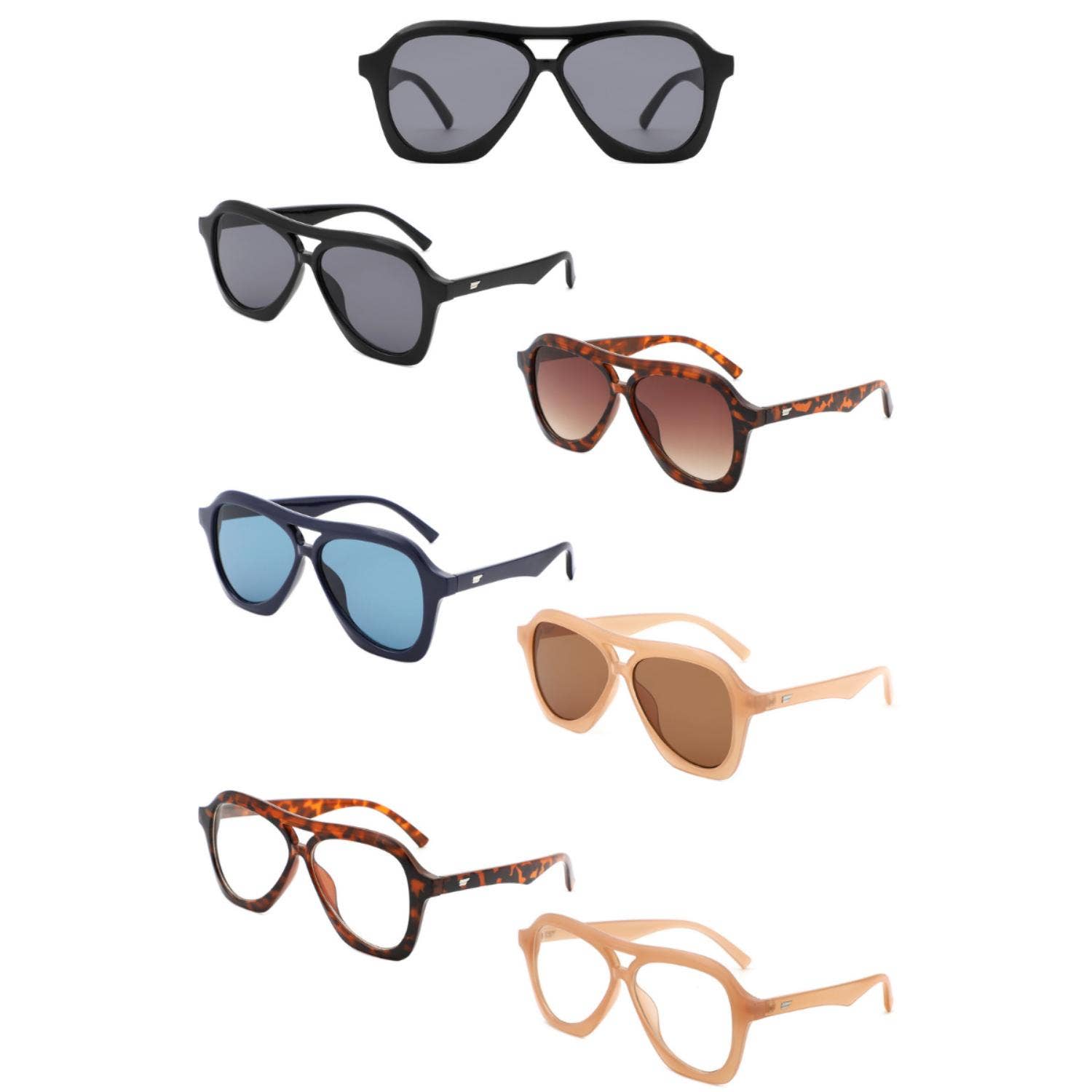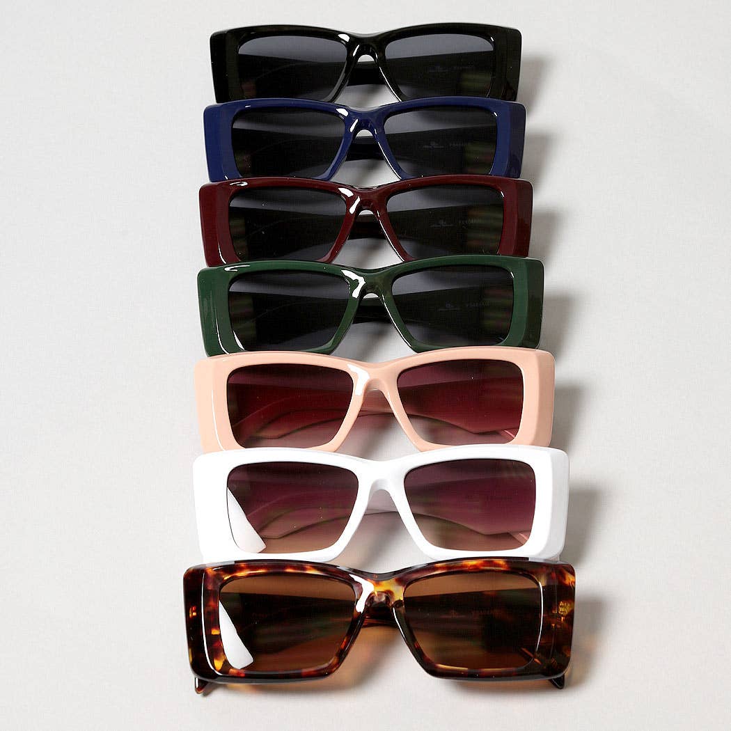 These trendy rectangular sunglasses feature a thick, bold frame with a vintage-inspired aesthetic. The slightly rounded edges add a touch of softness, making them both stylish and versatile. Available in classic black, tortoiseshell, and translucent tones, these shades offer a perfect balance of retro charm and modern appeal. Designed for comfort and durability, they provide full UV protection while elevating any look. Frame Material: Plastic Lens Material: PC Frame Width: 140mm Lens Width: 50mm Lens Height: 32mm Bridge Width: 22mm Temple Length: 138mm 100% UVA & UVB Protection One size fits most One dozen assorted/mixed colors Color count is not even and may vary