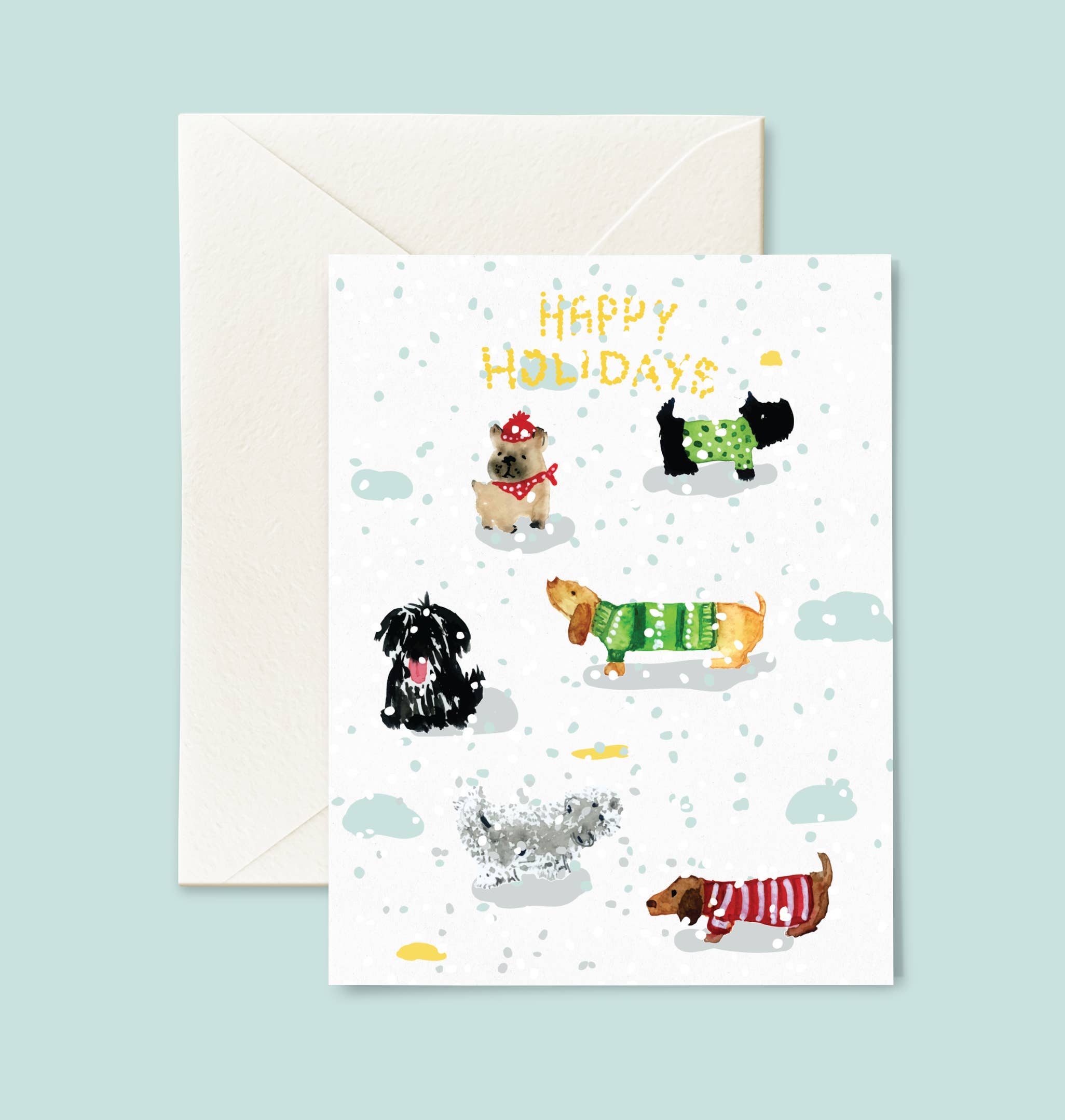 Glistening snow falls upon this adorable watercolor painted dachshund with a red nose. - A2/ 4.25"x 5.5" / 108 x 140mm - Folded card, blank interior - Printed on FSC Recycled, 110 lb cardstock - Accompanied by a recycled envelope - Packaged in a protective, biodegradable PLA transparent sleeve