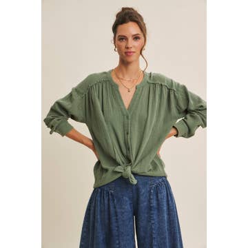 NT11914-Mineral Washed Gauze Button Down Shirt Top
