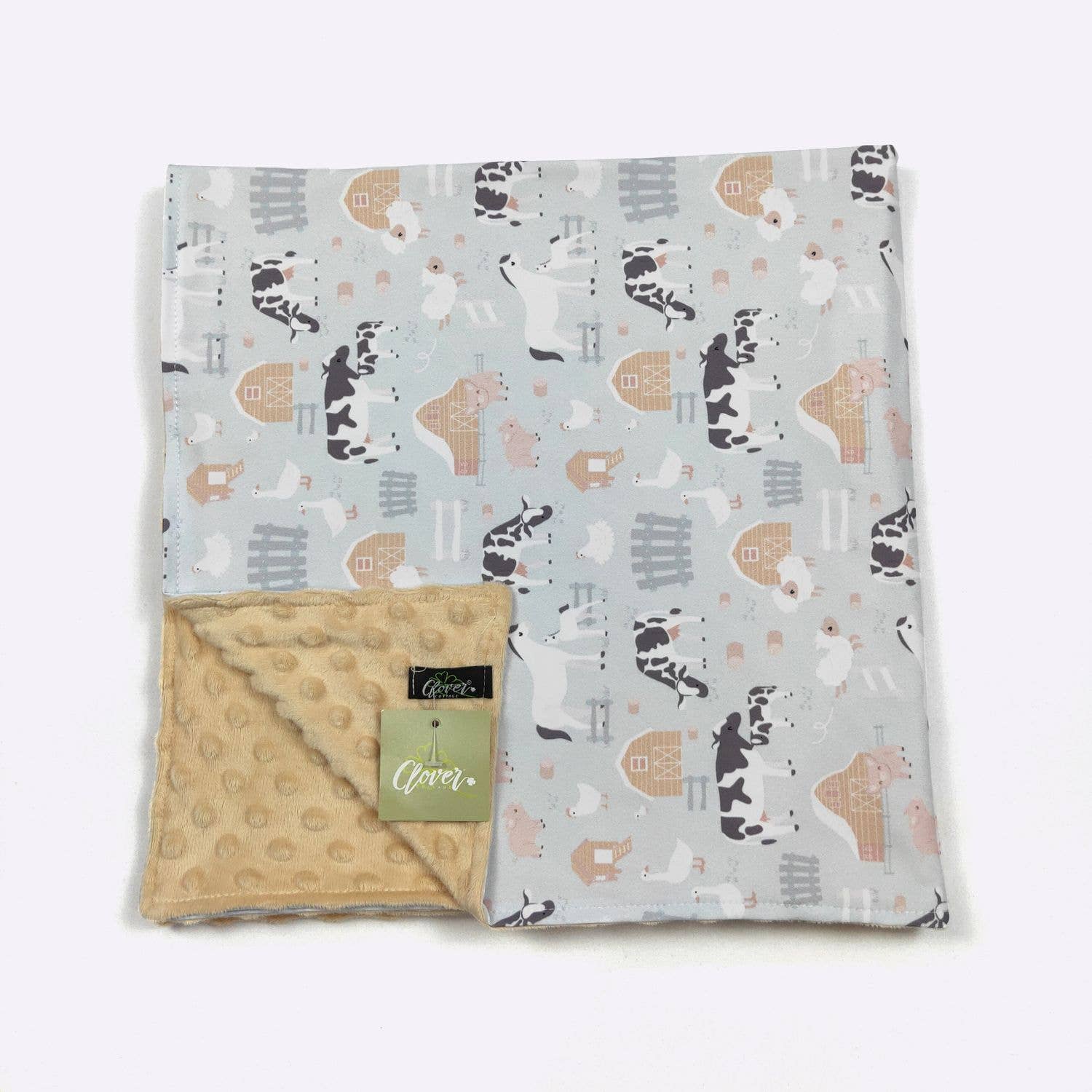 This farm animal blanket is becoming one of our customer's favorites! It's our own unique design/pattern so you don't see it everywhere. Details: - Premium Quality: 100% minky (polyester) on both sides to provide only the softest touch for baby's delicate skins. - Generous Size: 30x40 inches (great for 0-3 yr old) - Vibrant colors with a beautiful design on one side and the popular minky dot texture on the other. - Machine washable (wash cold and tumble dry low). - Each blanket is tied with a cream color ribbon and packaged individually.