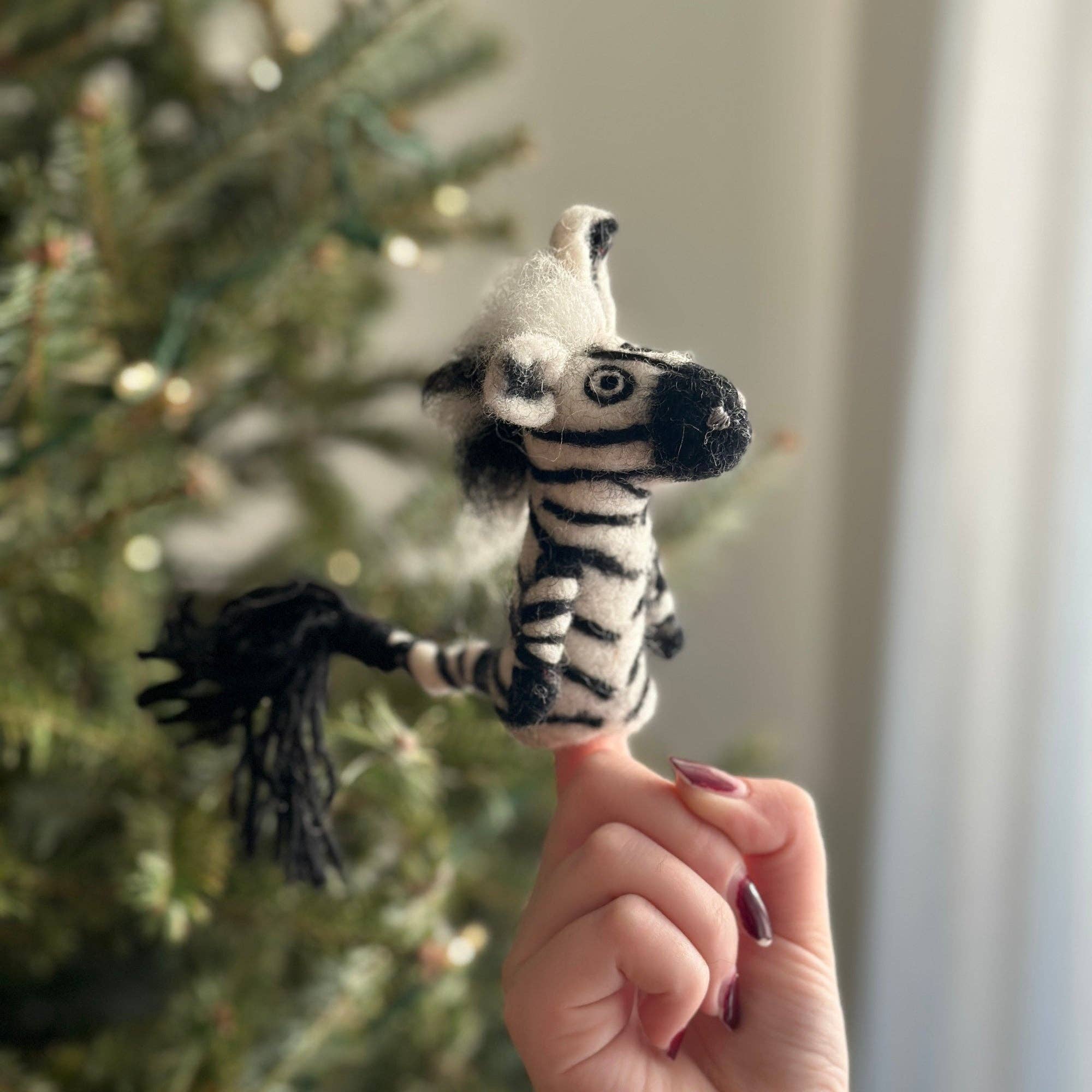 Needle-Felted Zebra Finger Puppet with Fluffy Mane Bring the wilds of the savanna to your fingertips with our needle-felted zebra finger puppet! This charming puppet features needle-detailed fur, capturing the iconic black and white stripes of the zebra, and a playful, fluffy mane that's sure to bring a smile to your face. Perfect for storytelling, playtime, or learning about wild animals, this finger puppet is the perfect gift for wild animal lovers. Order now and let the wild adventures begin!