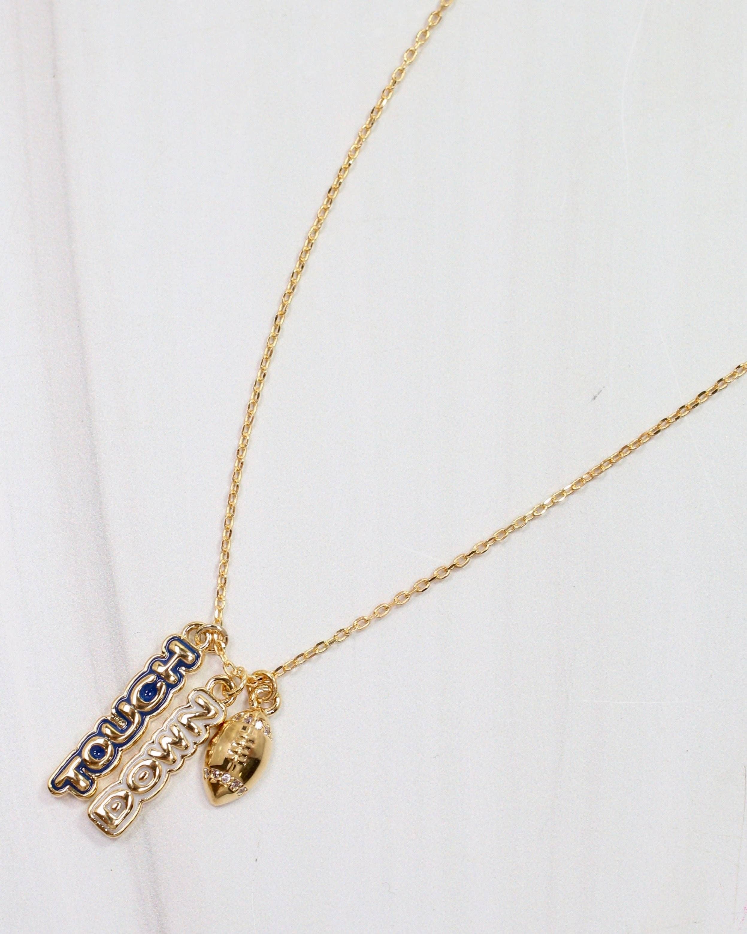 Celebrate your team spirit with this playful Enamel Touch Down Necklace! Featuring a vibrant red and white enamel charm alongside a sparkling gold football adorned with CZ stones, all hanging from an 18K gold-dipped chain. It's the perfect accessory to show off your love for the game with a fun, stylish twist. Dimensions: * 16" Length * 2" Extender * .8" Drop (Longest Charm) * 18K Gold Dipped