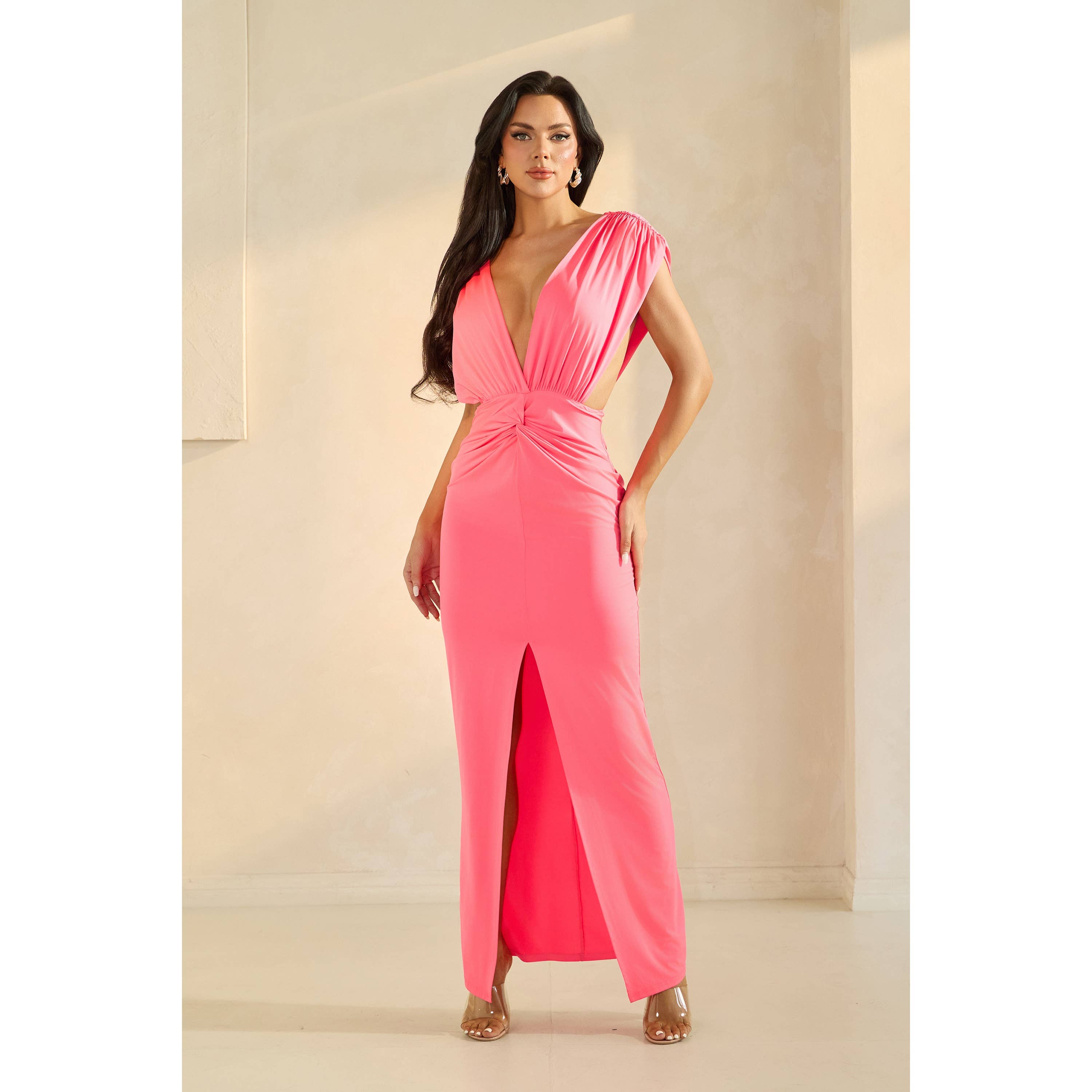 - Style No.:JT2579H This stunning evening gown is a showstopper, perfect for making a grand entrance at any formal event. Crafted from shimmering iridescent fabric, the dress features a holographic sheen that catches the light beautifully, revealing a spectrum of colors with every movement. The design boasts a strapless sweetheart neckline, elegantly framed by a twisted knot detail at the bust, which creates an alluring keyhole cutout. A thigh-high slit on one side adds a hint of allure, making this gown both elegant and daring. Ideal for proms, galas, or any special occasion where you want to shine, this gown is a must-have for your collection.