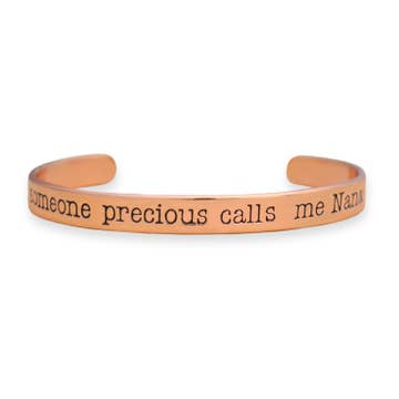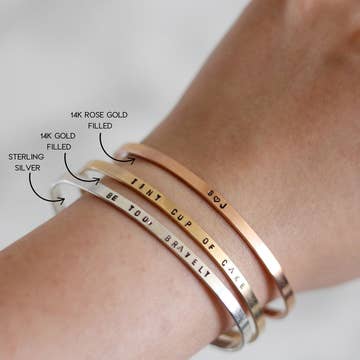 Our stylish skinny cuff bracelet is perfect for mom, featuring names and words in a cute typewriter font. This cuff looks perfect alone and is also great for stacking. Each bracelet is handmade to order for you and each one is a little different due to the nature of hand stamping. ABOUT THE JEWELRY * Select your text based on the character count. * Your bracelet will be stamped in LOWERCASE typewriter style letters * The cuff measures 1/8" x 6" and will fit most women's wrists. ABOUT THE METALS -The 16-gauge red brass is tumbled, polished and beautifully bright yellow and shiny. -The 16-gauge copper is polished to a gorgeous rose gold glow and feels warm and lovely. -Sterling silver does oxidize over time with exposure to the elements, but any silver polish will restore it to its original beauty. The sterling bracelet is 18-gauge The vegan ink will fade over time. Keeping your stamped metals out of water will help to lengthen the life of the ink.