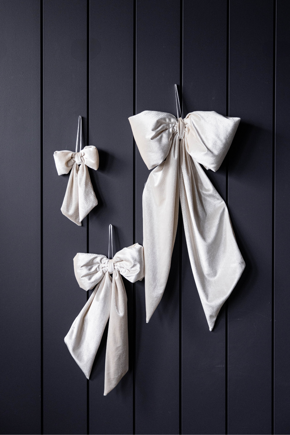 Dimensions Large- 30" W x 66" H Medium- 20" W x 46" H The Luxe B Co. Oversized White Velvet Bow is a trendy double-sided bow made from soft, luxurious velvet. Our oversized bows are filled with cotton to give their eye-catching full structure, while the ends give their whimsical aesthetic to let you drape the bow on your tree or hang it on your wall. Use our soft cream Oversized Velvet Bows to decorate your home for the holidays or any other special occasions. Available in Large or Medium sizes Each bow includes a Luxe B Co embroidered tag