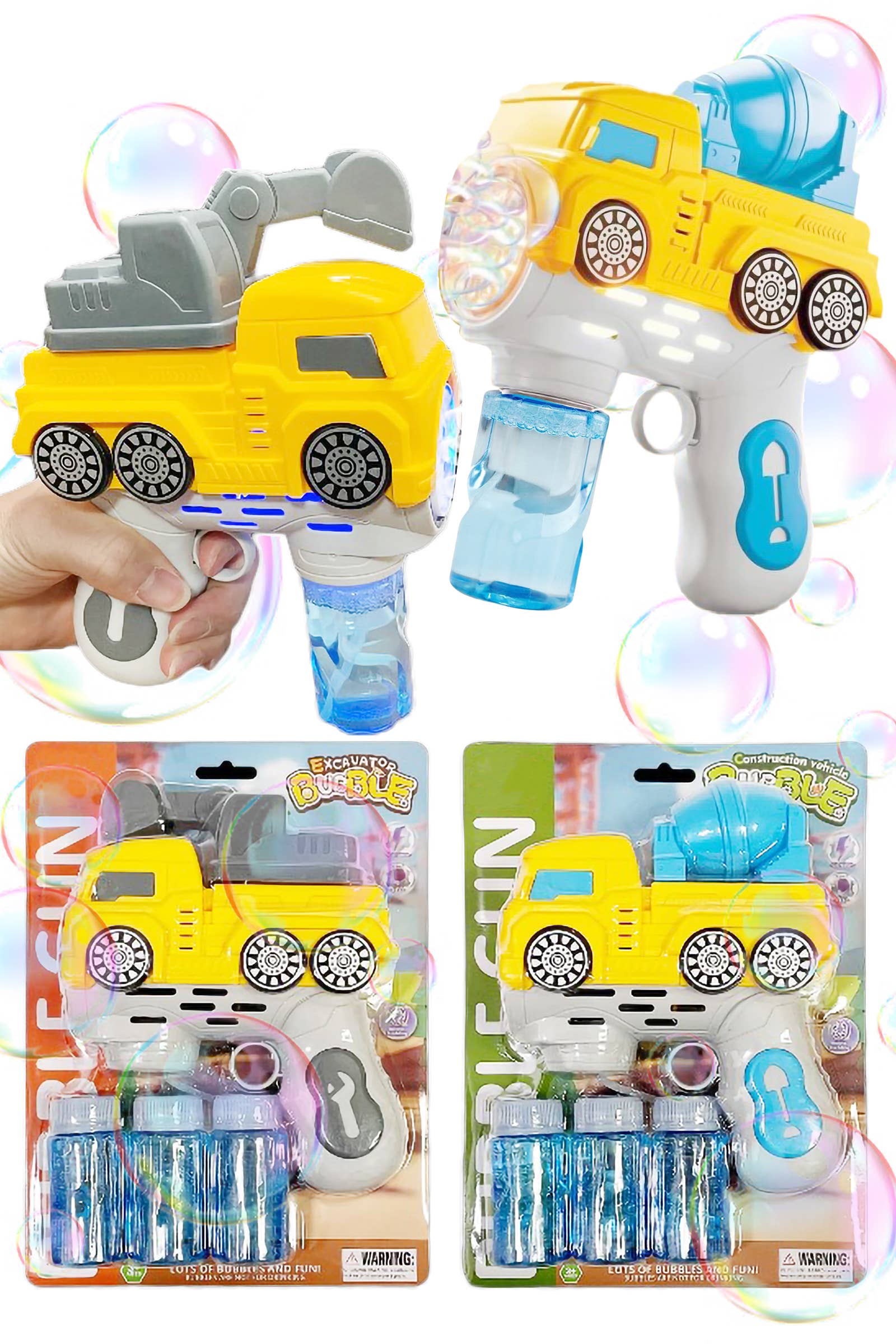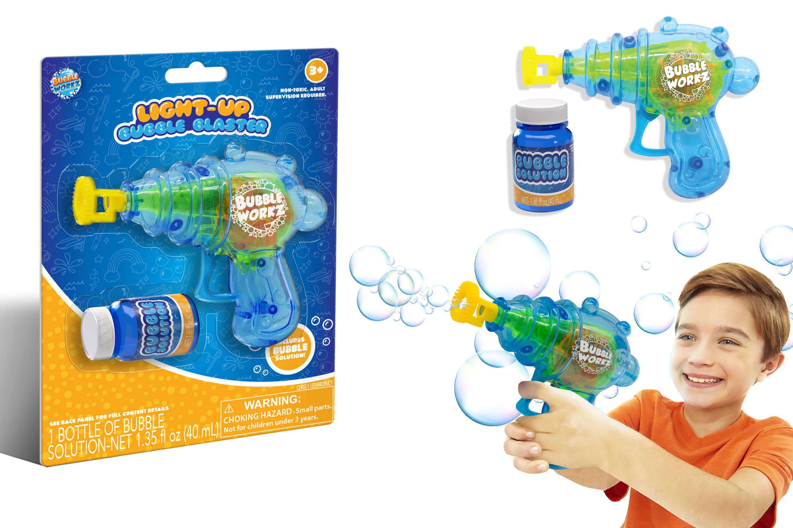 Pull trigger to activate bubbles and lights. Product comes in colorful packaging for in store merchandising. Key Seasons & Features: Summer Toy, Summertime Toy, Outdoor toy, bubble toy.