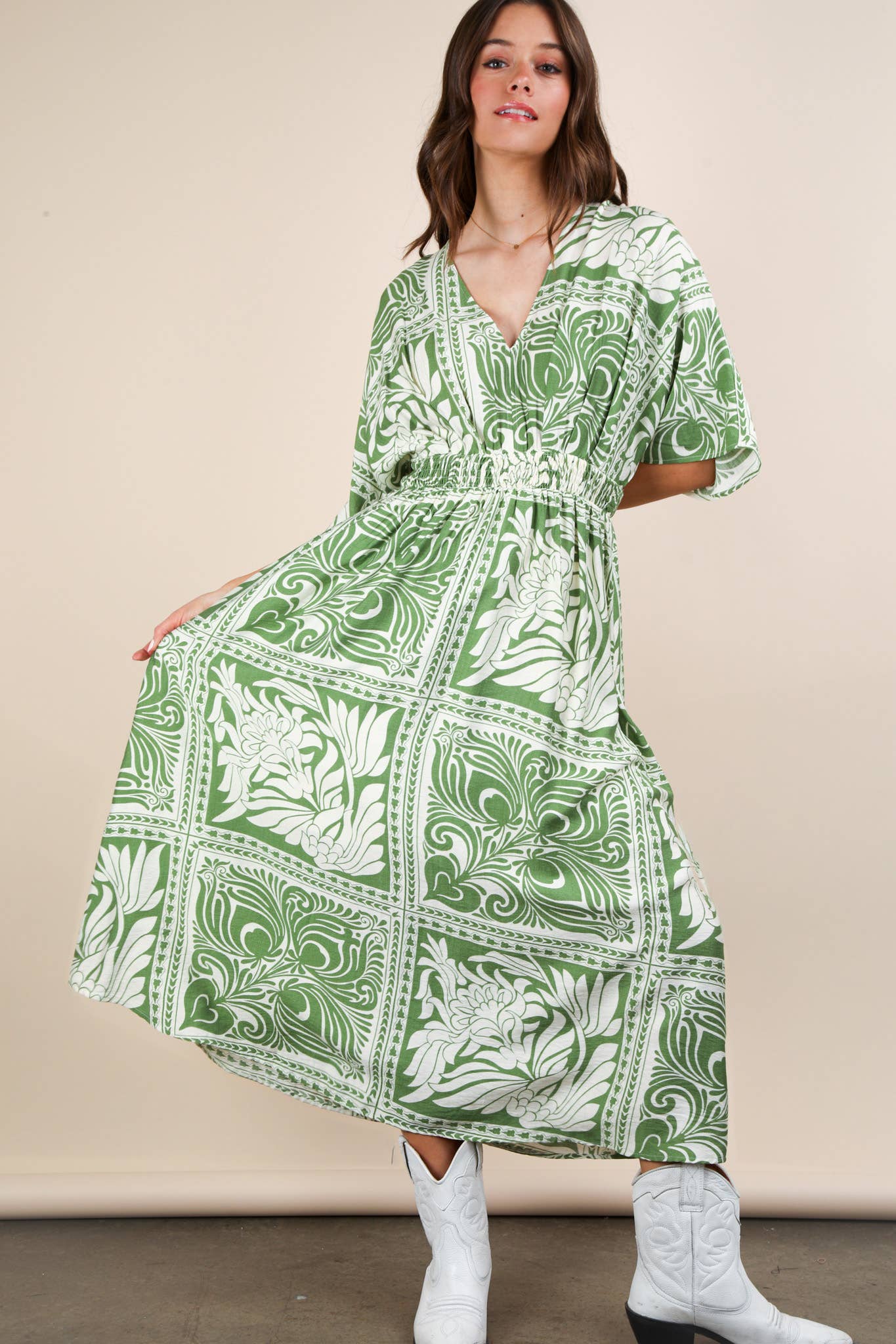 ND31592-Printed V-Neck Woven Mini Dress