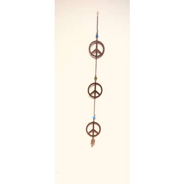 Celebrate your inner hippie with this beautiful bronze-tube windchime. What is now known as the Peace Sign was originally designed in 1958 as the logo for Britain's Coalition for Nuclear Disarmament (CND). Made from a blending of the semaphores for N (flags held at 4 and 8 o'clock) and D (flags held at 12 and 6 o'clock), it migrated to the US in the 60's and gained a broader definition as a symbol of peace. It has become one of the most widely known symbols in the world. Our Peace Chime incorporates the peace symbol in a stunning flame-finished stainless steel windcatcher. In keeping with the theme, the wind chime is musically-tuned to the notes of the second line ("...and let it begin with me") from the popular hymn "Let There Be Peace on Earth."