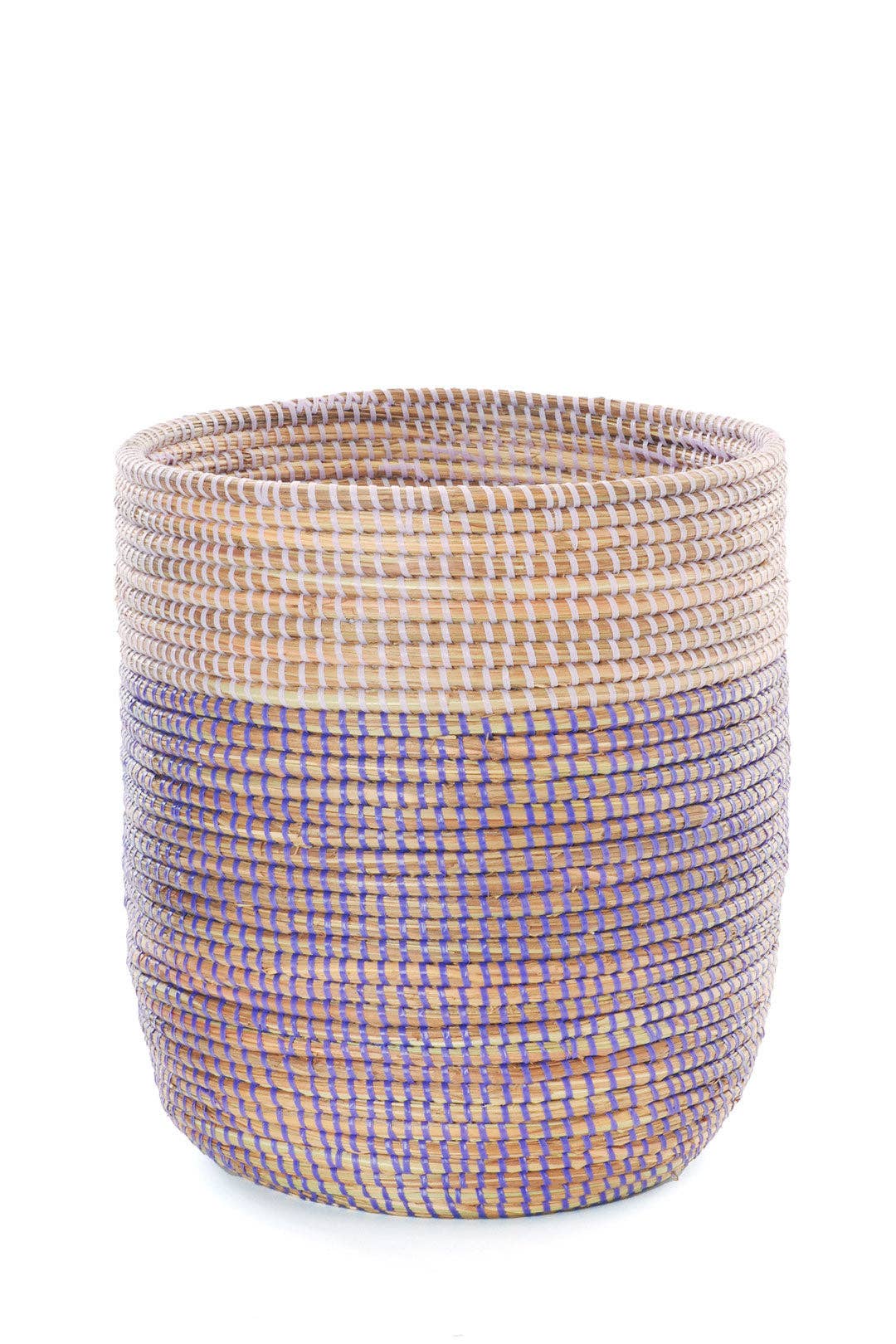 Wolof women in the West African nation of Senegal update traditional coil weaving methods by entwining natural grass coils with purple strips of plastic, salvaged from a Senegalese prayer mat factory. Cattails grow abundantly in rural Senegal, so women can earn a sustainable income from basket weaving while enriching homes around the world with modern African craftsmanship. This classic-style laundry hamper storage basket features cutout handles and a flat lid that is fitted around the basket edge. Sold singly. Because this is a handcrafted item, each will vary slightly. Dimensions: 18"H x 15"D Crafted from: Typha (cattail) stalks, plastic Made in: Senegal