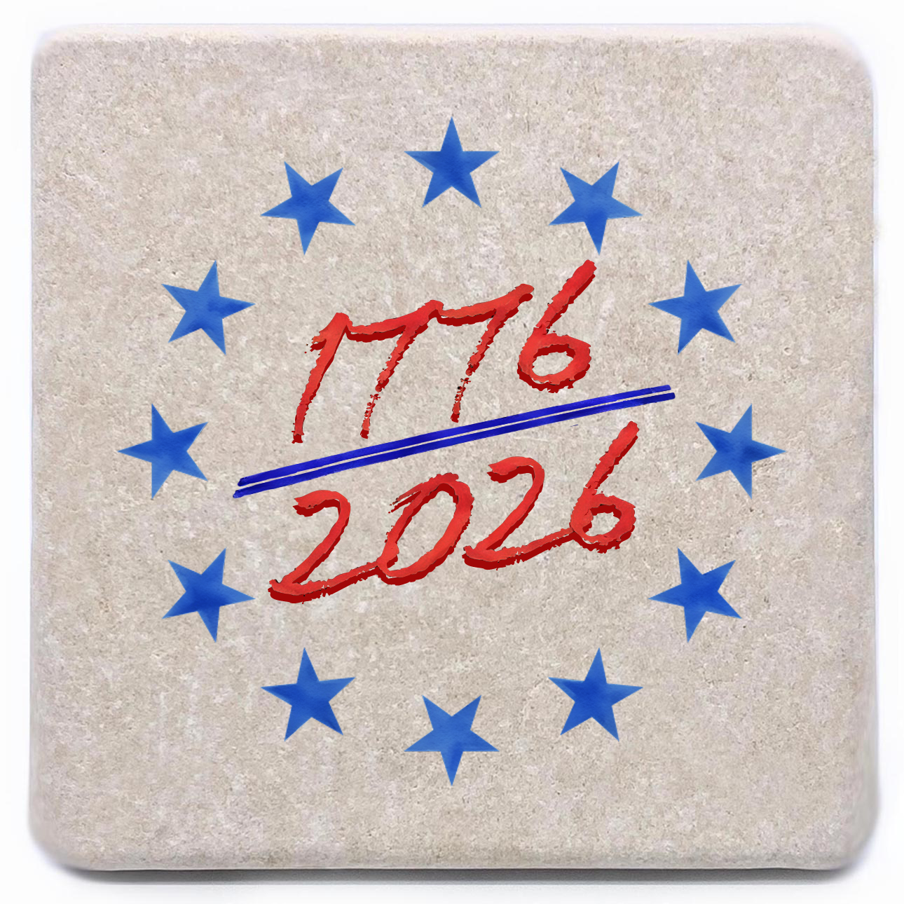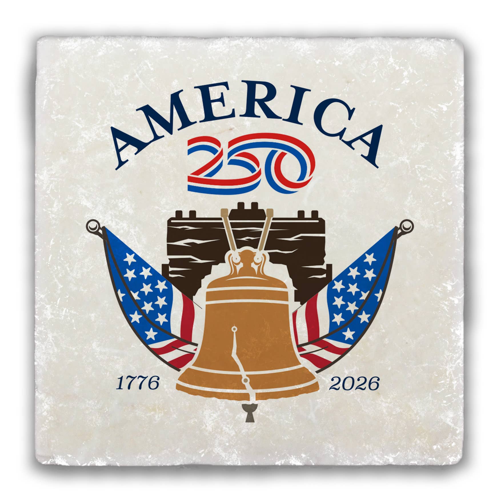 This tumbled stone coaster features an illustration of a cannon and an American flag with text that reads America 250. Save your counter from spills and stains with these patriotic coasters, or buy some as a gift for a friend! Each coaster is 4 in. x 4 in. and stands 1/2 in. high. As these are cut from real rock, the white flecks and edging on each one will be unique. They are easy to clean, and come with a cork bottom to prevent slipping, and heat transfer. You can buy them in singles or packs of 4. ( COAST2-AM250A-CANNON ) The AMERICA 250® word mark and logo are trademarks of the U.S. Semiquincentennial Commission and are used by Nelson Enterprises under license.