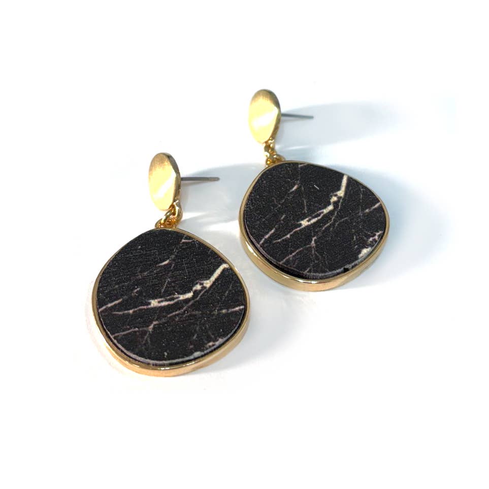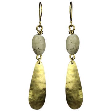 18k Gold plated brass hooks with synthetic black emperor stone, brass, and olivine glass. Each earring weighs .09 oz. and measures 2.125 inches in length from top to bottom.