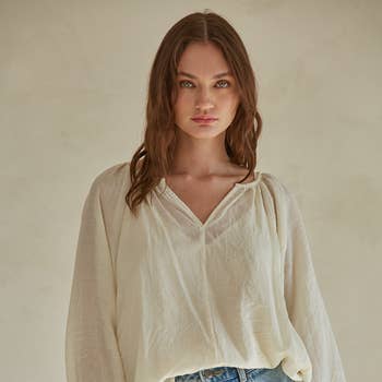 - Lightweight Texture: Made from soft pleated woven fabric with natural crinkle for subtle visual movement - Dramatic Bell Sleeves: Wide, flared sleeves add flow and drama to each movement - Open Tie-Back Design: Features a playful open back with two adjustable tie closures for a secure yet breezy fit - Asymmetrical Hemline: Angled cut creates a modern silhouette with a slightly cropped length - Boat Neckline: Clean neckline balances the drama of the sleeves and open back - Model is 5' 8" 30-24-34.5 and wearing a size Small This boho-chic blouse adds movement and edge, perfect for breezy styling from day to ni