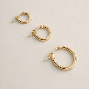 Your search for the perfect staple hoop ends here. These midi hoop earrings feature a hinge-style closure for easy breezy style. Bold enough to make a statement but minimal enough for everyday wear, these lightweight lovelies are available in 3 sizes and are the ideal pairing for one of our hooplets. Delivered from the Made by Mary studio in a giftable book-style box, each piece is carefully crafted with your story in mind. Details * Color: 14k Gold Filled or Sterling Silver * Size: * 13mm, 19mm, or 29mm Outer Diameter * Additional Information: * Sold as a Pair * Hinged Closure