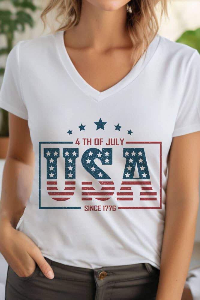 SKU: 185375 Aesthetic: Classic and Retro / vintage Care Instructions: Machine wash Color: White Fabric: 100% Pre-Shrunk Cotton Fit: Unisex Occasion Theme: Everyday, Fourth of July, and Memorial Day Occasion: Day Party and Everyday Pattern: Graphic Sleeve Length: Short Sleeve Theme: Patriotic Product Language: English Weight: 121.9 g (4.3 oz)