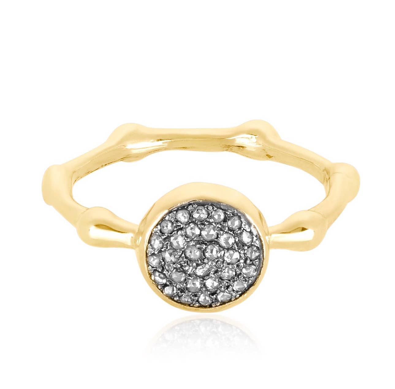 brass based adjustable ring with pave stone multi disc design. open adjustable design.