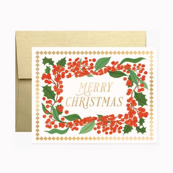 A beautiful holiday gift in paper form with gold foil. Full - color 4.25" x 5.5" folded cards. Blank interior. Ivory envelope included. Our greeting cards come individually packaged in an enclosed plastic sleeve.