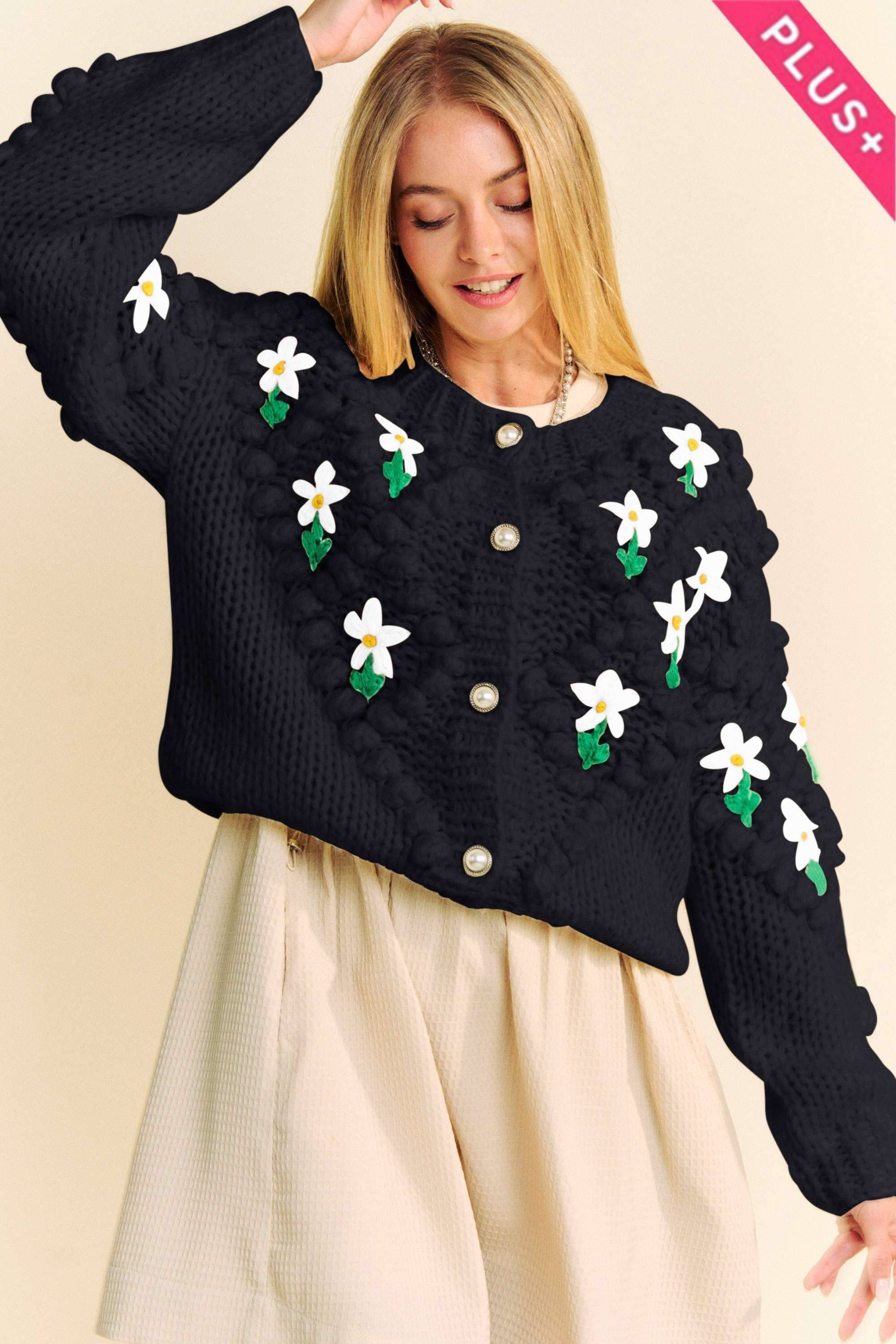 PLUS SIZE V NECK BUTTON DOWN LONG SLEEVE EMBROIDERED FLORAL LOOSE FIT OVERSIZED SWEATER CARDIGAN