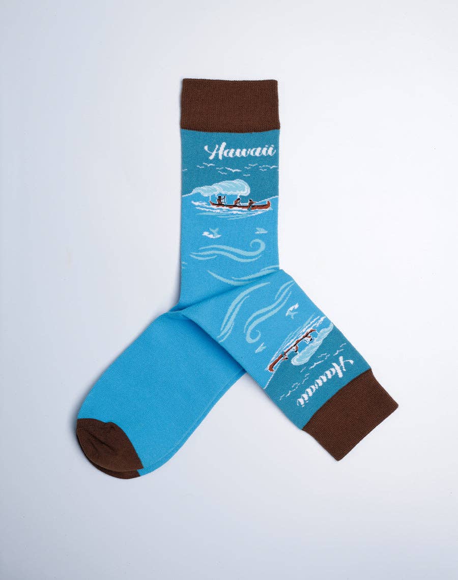Experience the beauty of the islands with the Mens SUP Stand Up Paddle Board Crew Socks. These sky blue socks feature a stunning tropical design of a paddle boarder in the ocean with lush Hawaiian mountains in the background. Picture this: you're in Hawaii, on a stand up paddle board just offshore, out in the beautifully blue tropical ocean. The sun is shining, the birds are chirping, the whales are breaching, and the waves are slowly and calmly passing by. You meditatively paddle, stroke after stroke, with no where to be. Just you in the nature of a tropical paradise. Ahhhhh. If you love activities on vacation, these SUP Crew Socks from our Hawaii Island Collection are for you.