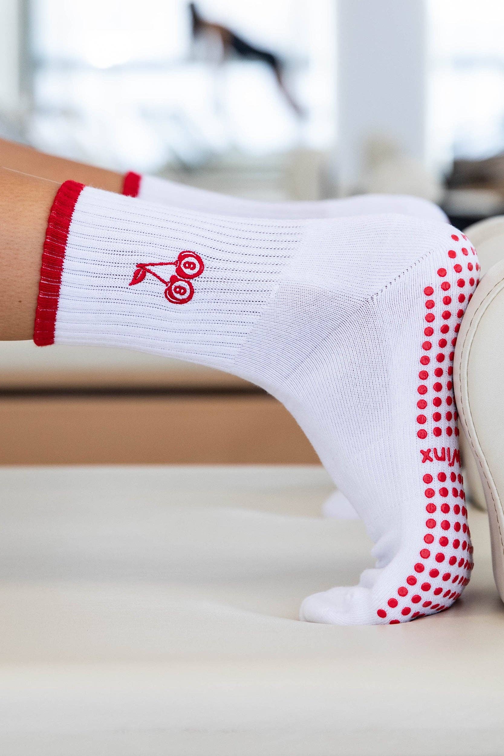 Our speckled blue trimmed frilly grip socks are the perfect addition to your workout! With a new improved style now featuring arch ribbing for extra stability and a thicker sole for enhanced comfort and durability. Not only do they look fabulous, but their grippy soles keep you stable on your mat or reformer, so you can master every pose with confidence. Perfect for Pilates, Barre, Yoga, or any workout, these socks also offer added stability for running, sports, and weightlifting. Plus, they're designed to help prevent slips, making them a great choice for everyone.