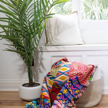 This is a washable lightweight multi-season quilted blanket/ throw, handmade by artisans. Eco-friendly, upcycled fabric for conscious fashion. The fabric was sourced from surroundings clothing manufacturer that would have been otherwise discarded. * Because of the upcycled material and handmade nature of this item, each quilt blanket throw is not alike. The print will be of slightly different pattern and color but in variation of black, blue, pink, purple, green mix pattern. * This quilt throw is reversible. Pictured is front and back of the throw blanket * Made from printed fabric * This blanket/ throw is hand sewn by our artisans in Java and made using printed fabric. Each blanket takes one week to make. * The quilt is made from fabric squares. * Size: 55"x87". * Material: rayon & polyester mix * Machine washable in cold, delicate setting and air dry * Lightweight blanket with print quilt on both sides. Both sides are made of quilted fabric. No filling in the blanket. * Rounded corner instead of square corner showcasing our artisans’ sewing skills * Some of the fabric may have inconspicuous pattern drawing since this quilt was made using left over fabrics.