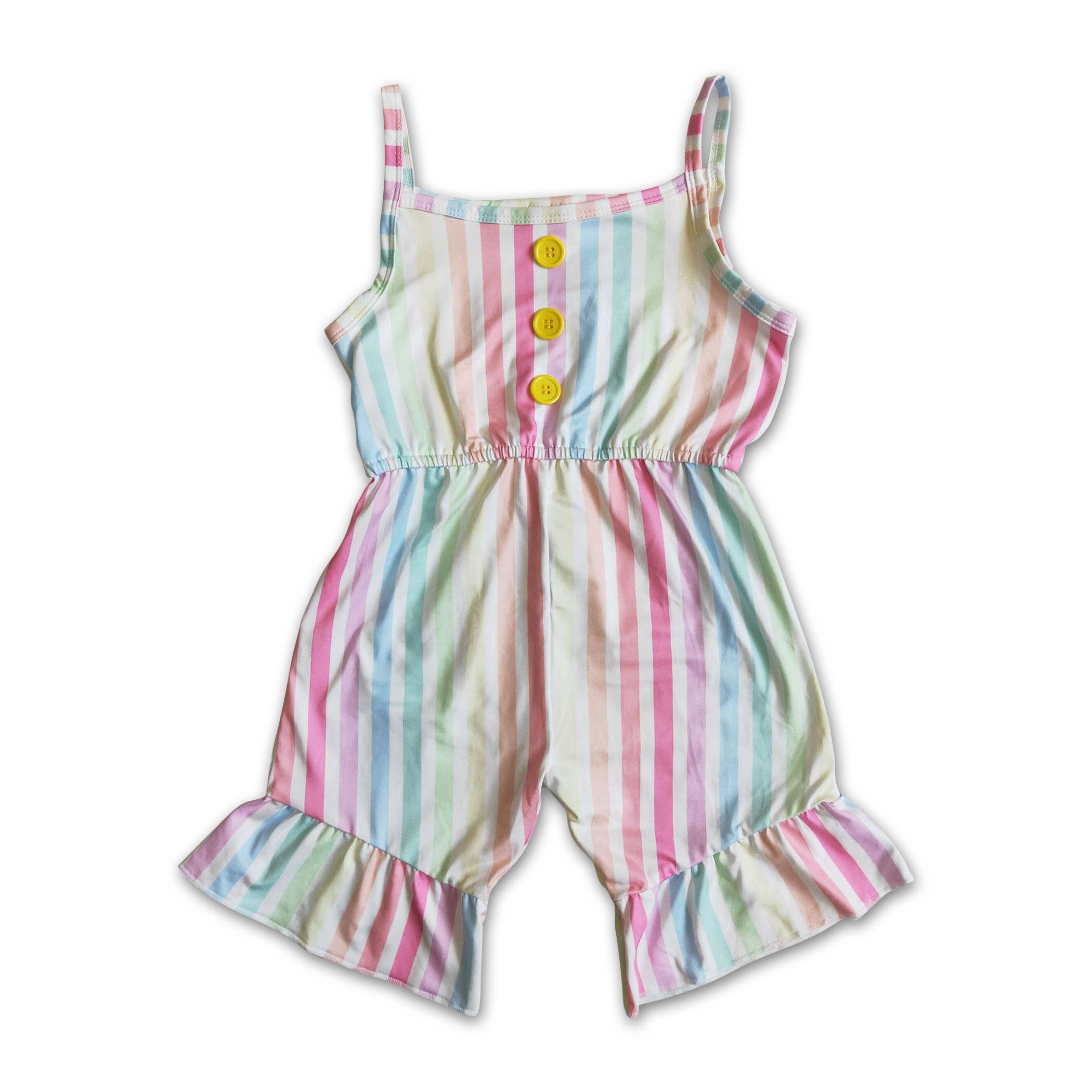 This stylish girl's romper features a delightful pastel plaid pattern with shades of pink, blue, yellow, and green. Designed with shoulder straps and a cinched waist for a comfortable fit, it also has ruffled hem details that add a playful touch. Perfect for warm weather, this romper is ideal for casual outings and playtime. Fabric Care 100% COTTON / 100% POLYESTER