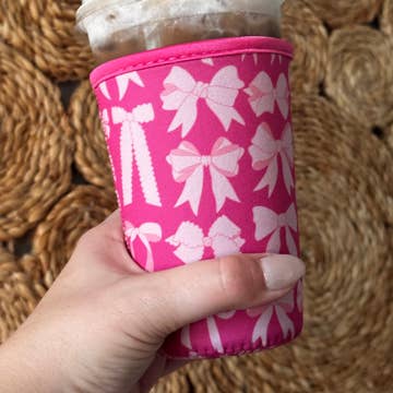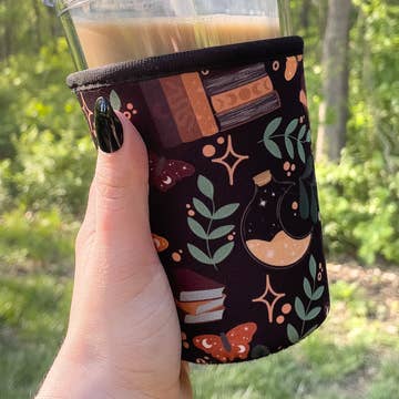 • iced gingerbread house and snowflakes on a red background w/ red sleeve rim • hand-drawn original design • neoprene material keeps your drinks cool and your hands dry • the small size will fit best on 12/16oz drink cups (Starbucks tall/grande or Dunkin' small) and is 4" tall • the medium size will fit best on 24oz drink cups (Starbucks venti or Dunkin' medium) and is 5" tall • the listing image shows a medium sleeve on a 24oz iced drink