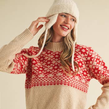 Make every casual day feel special in this cozy and whimsical sweater. Designed with a mock neck, long sleeves, relaxed fit, ribbed trim, and a vibrant pink moose graphic on a rich emerald background. Complete the look with leather skirts, ankle boots, and a playful crossbody bag for an on trend winter outfit. - Sweater - Long sleeves - Mock neck - Relaxed fit - Color: Emerald Size + Fit - Model is 5'9" and wearing size XS - Measurements taken from size S - Chest: 19 3/4" - Length: 24"