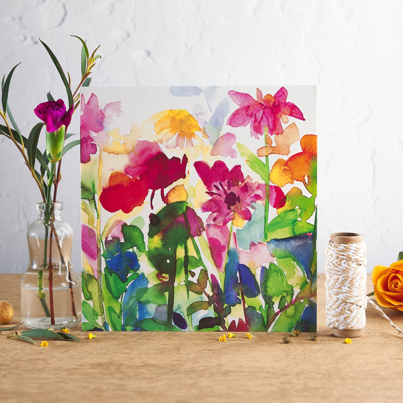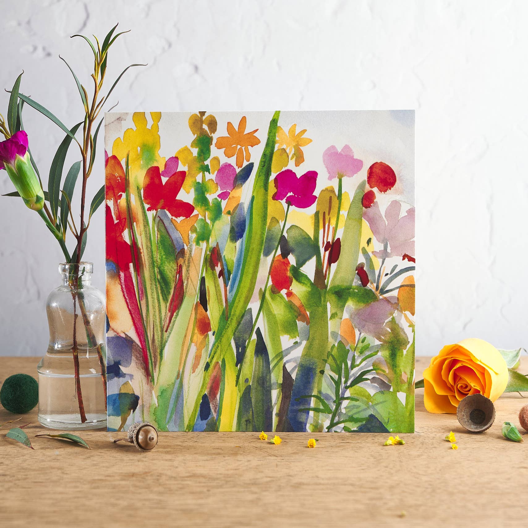 Our collection of bright and vibrant watercolour images, from the flower and allotment garden. All the designs are taken from Diana Fegredo's original watercolour paintings. Ideal for many occasions - to say Happy Birthday, Get Well, Thinking of you, or send a cheerful colourful note. 150mm square. With envelope. Blank inside for your own special message The cards come packaged a cello bag Sold in units of 6 cards