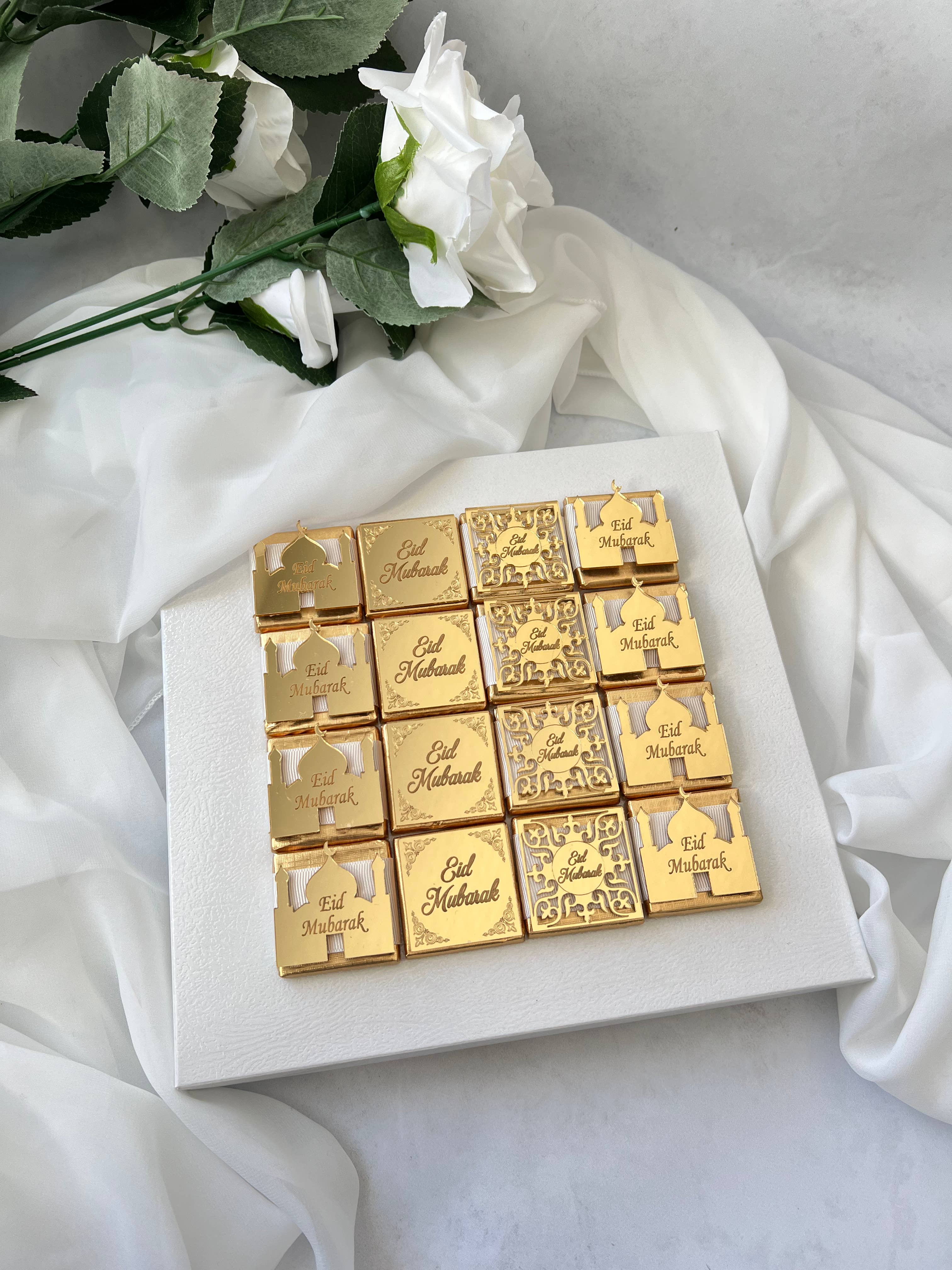 This eid mubarek chocolate box is the perfect gift for your guests! The box includes delicious chocolates, each with a different flavor to commemorate the Islamic holiday of Eid. The box is also adorned with beautiful ramadan kareem favors, making it the perfect way to show your appreciation for all your friends and family who are celebrating Eid. Finally, the custom muslim wedding gifts are the perfect way to show your loved ones that you care about their special day. Give the gift of happiness this Ramadan season! Our chocolates are of high quality and have 2 options, including milk and dark chocolate. It has a shelf life of 6 months in a cool environment away from direct sunlight. Do not put in the refrigerator. We can design as you like, please let us know for special designs. There are plexi label options suitable for many events. Chocolate features; *7 grams *4x4cm *Milk and chocolate options *Silver and gold wrap color
