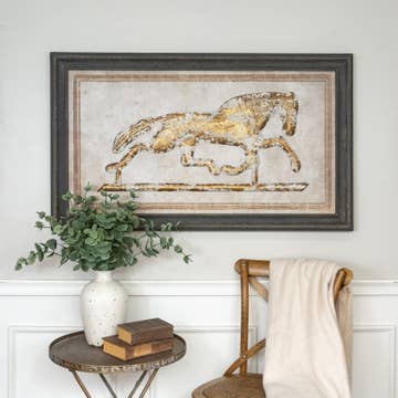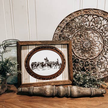 Immerse yourself in the rugged beauty of the Old West with our art print featuring a cowboy overseeing a herd of cattle being driven down a dusty dirt trail. Painted in soft beige neutral tones, the scene exudes the timeless charm of the frontier, while the cowboy's turquoise shirt and red bandana add vibrant pops of color. Bring home the adventurous spirit of the Wild West. • Printed with high resolution giclee inks • Fine art canvas mounted on wood • Solid hardwood frame in shown stain colors • Sustainable American alder wood • Made in the USA in our Utah studio • Mini 6x10" x 1.25" deep w/ 1/4 thick frame • 12x18" x 1.5" deep w/ 3/4" thick frame • 18x24" x 1.5" deep w/ 3/4" thick frame • 20x30" x 1.5" deep w/ 3/4" thick frame • 24x36" x 1.5" deep w/ 3/4" thick frame • Signs may have +/-1" variations • Signs can stand on a shelf or table or can hang on the wall from the back edge of the frame • Farmhouse style frames have rustic imperfections that make them unique