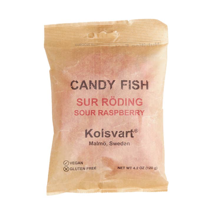 Kolsvart (which translates to “Charcoal Black”) is an innovative Swedish company focusing on simple yet innovative confectionaries. They have taken the concept of the traditional “Swedish fish” to a whole new level. Balancing taste and texture, Kolsvart continues to delight us with new flavors and experiences. Blueberry flavored.