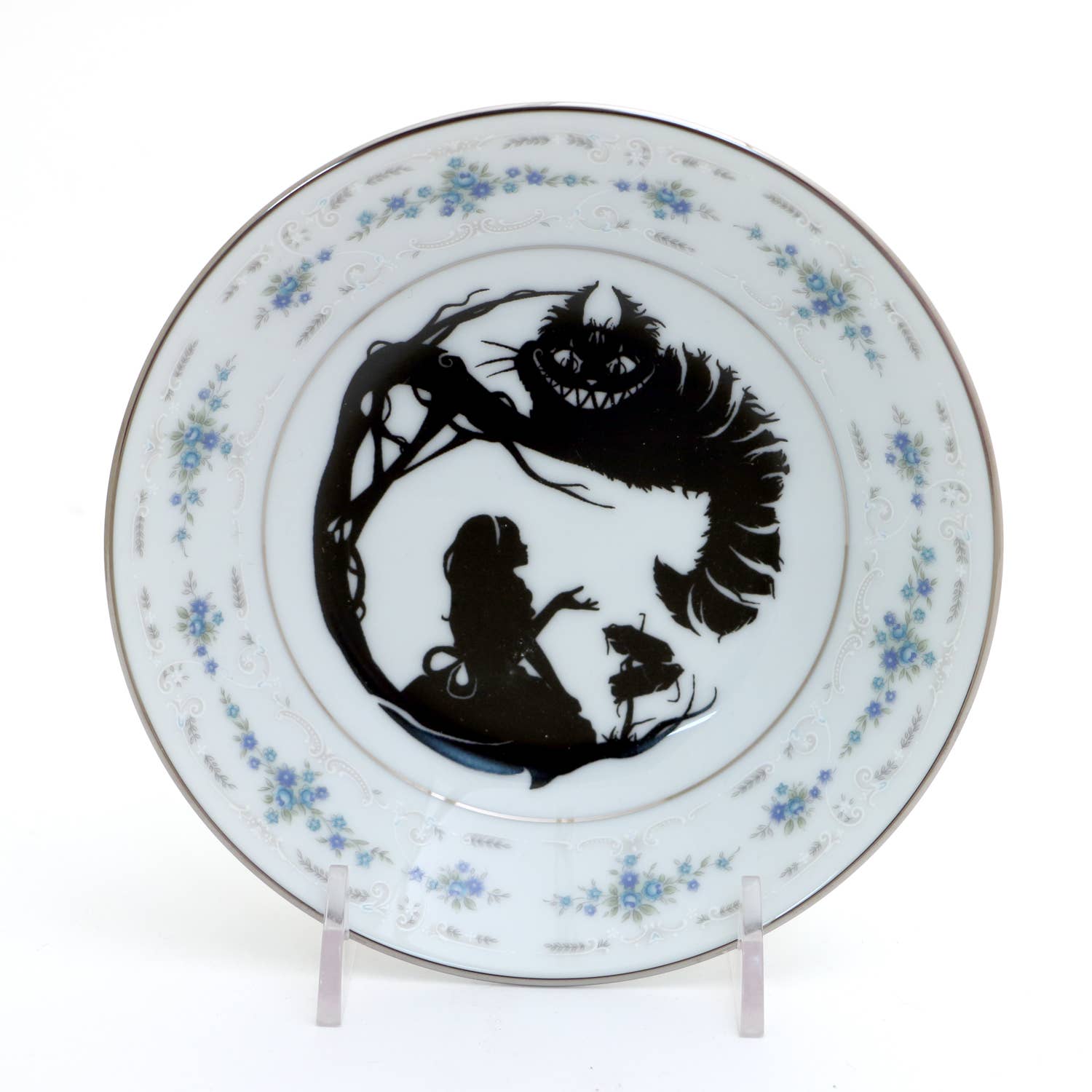 ASSORTED STYLES OF VINTAGE TEACUPS 1 each of Assorted Teacups and Saucers with the image of Alice falling through the rabbit hole on the front. The inside lip features a graphic of a teabag with the words "Drink Me" on the inside. All teacups in the program are predominately blue. Cups hold 6-8oz depending on style. LennyMud will select from a variety of fine china that has been professionally restored and altered. Price is for one Teacup and Saucer. All item are food safe. Hand wash recommended.
