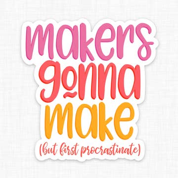 STICKER MATERIAL & FEATURES ⋙ professionally printed ⋙ made of durable, high-quality vinyl ⋙ matte finish ⋙ weatherproof ⋙ water-resistant ⋙ dishwasher safe ⋙ fade-resistant Measures approximately 3"x3" Sticker is designed, lettered, and illustrated by Rachel of Lemon Press Studio, featuring the phrase 'makers gonna make' surrounded by various art and craft supplies