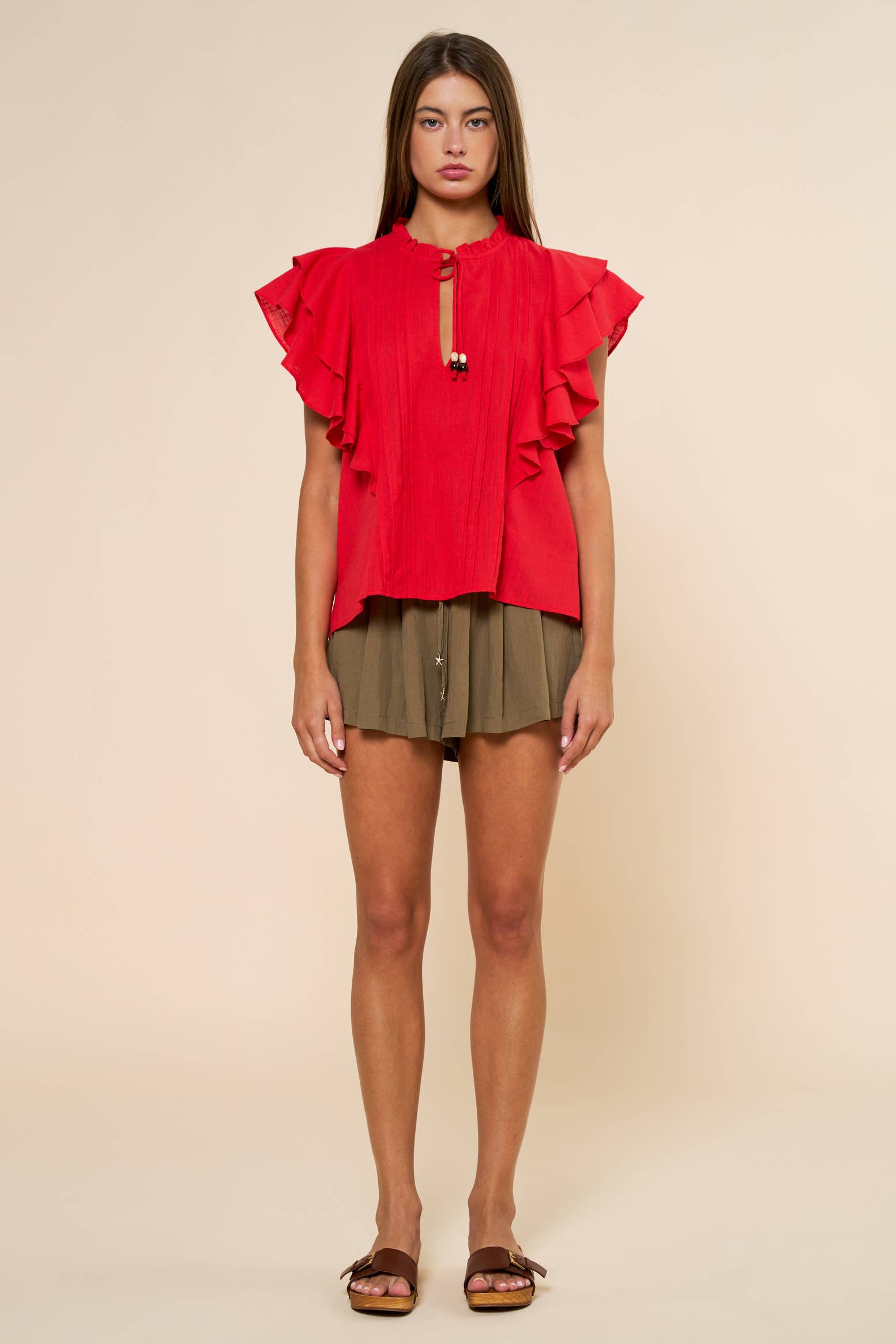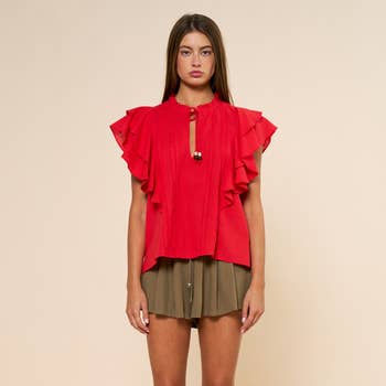 Sheer chiffon blouse with cascading ruffle trim and front tie detail. Also available in sizes S to L: Style no. IT18140. Total Length: 27 1/2" Content: 100% Polyester