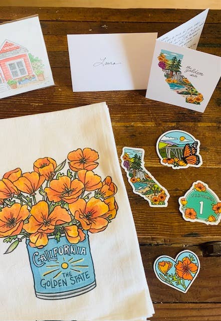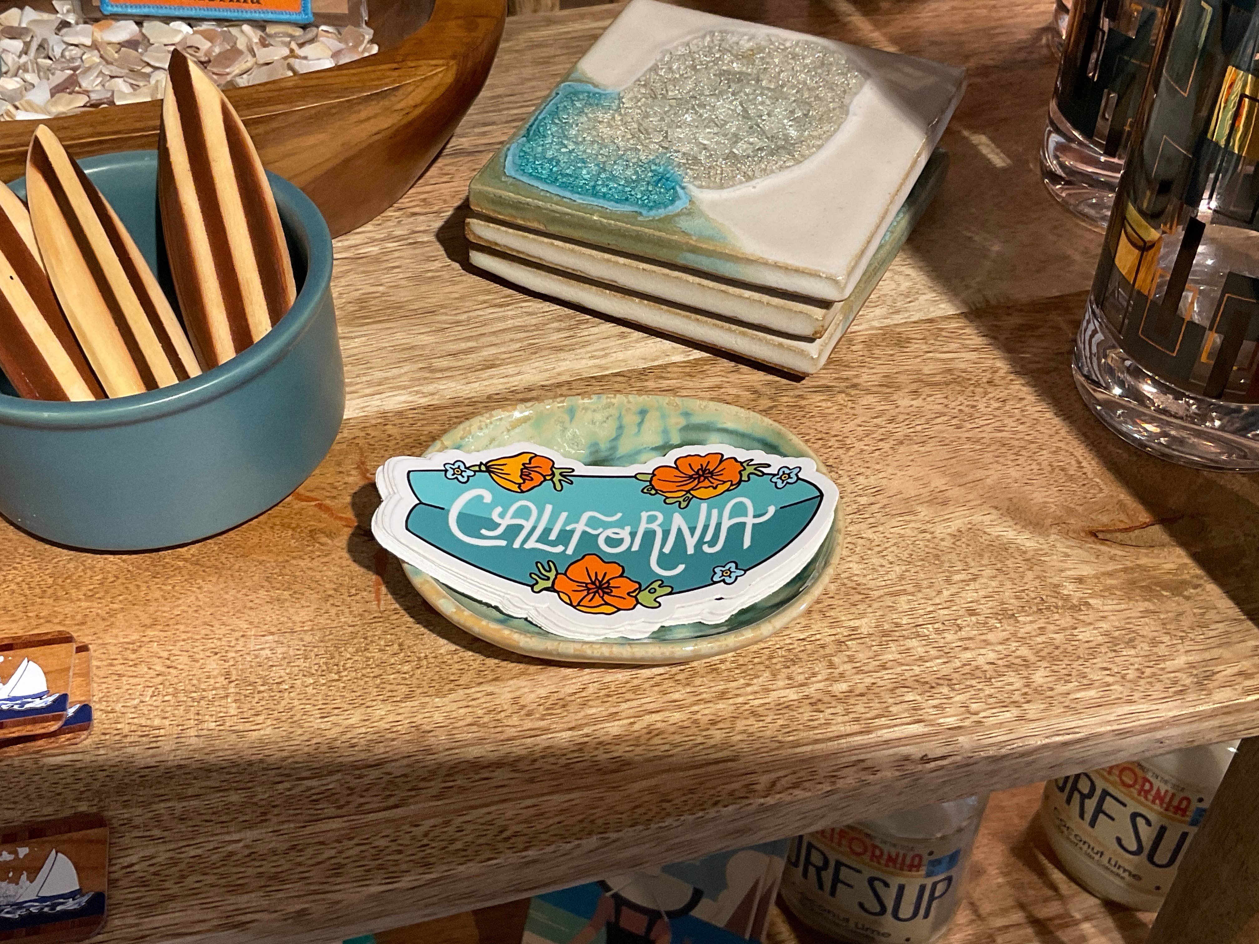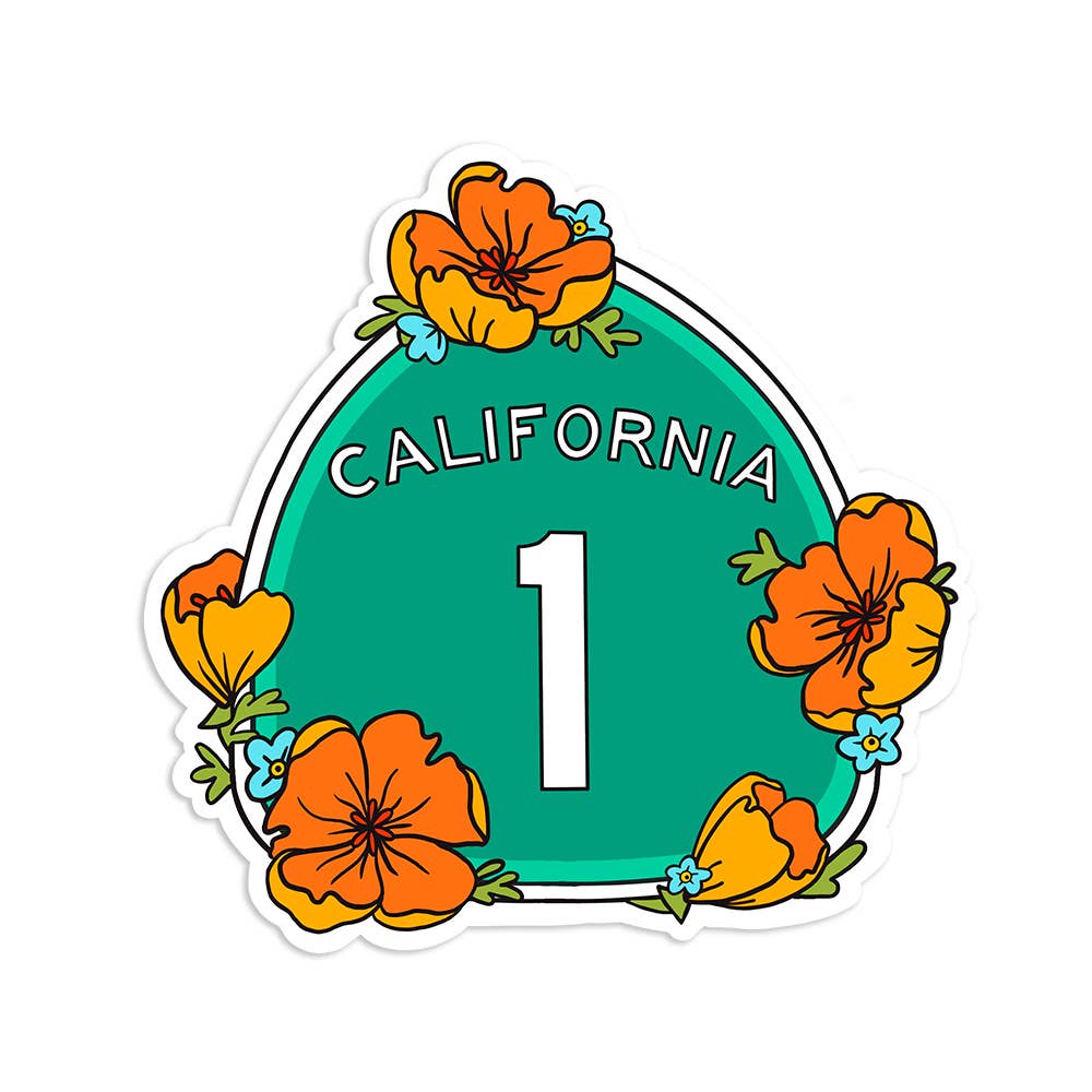 The famed coastal route, Highway 1 is the most scenic road in the state. Show your love for the California coastline with this sticker - it depicts the Highway 1 sign surrounded by golden poppies and native forget-me-not flowers. Perfectly permanent and ready for your water bottle, laptop, car window, or anywhere else you choose to stick it. • 2.9 x 3 inches • Clear border • Thick, durable vinyl • Waterproof • Made in the USA