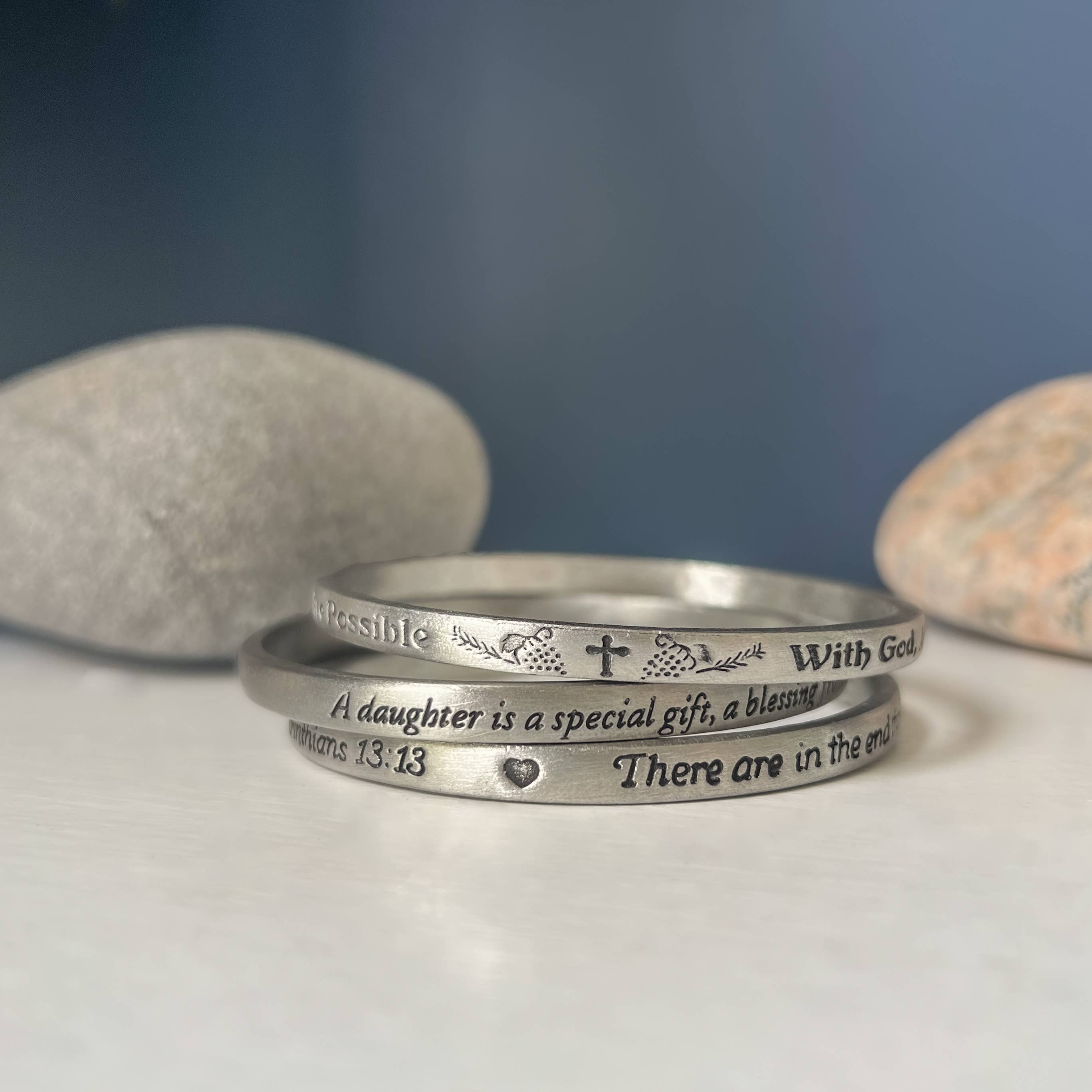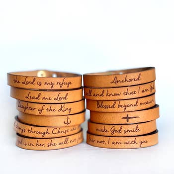 These bracelets are pretty. Love the scripture on them. I only wish they included the scripture reference.....and the leather could be a nicer quality. They are a very unique item to have in my store.