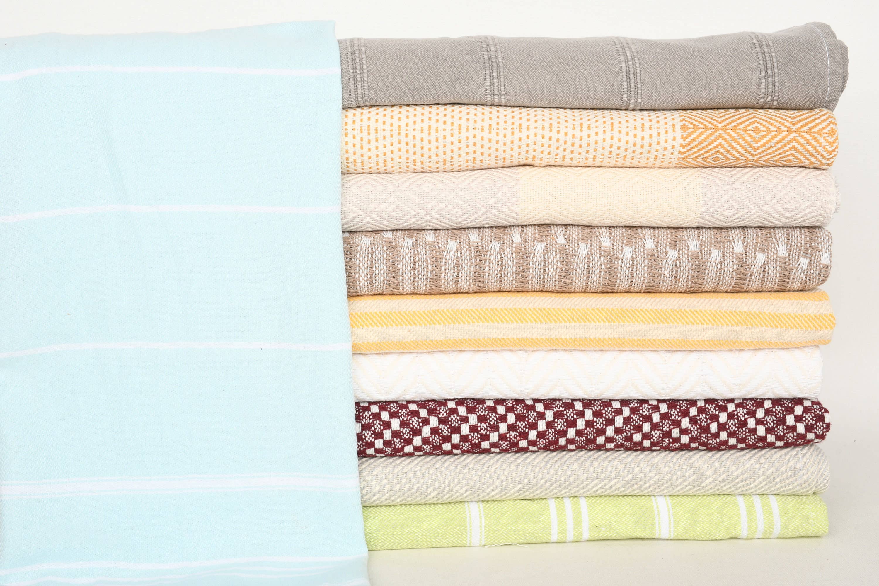 Made from cotton, these towels are soft, absorbent, and gentle on delicate dishes, making them a popular choice for kitchen linens. Handwoven Tea Towels - 100% cotton - Assorted Colors and Design Length - 27" Width - 19" Weight - 3.2 oz