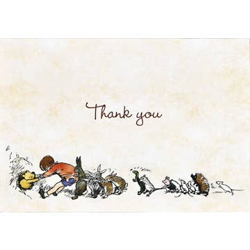 ''Silly old Bear!'' Adorable thank you note cards feature Ernest H. Shepard's art for Winnie-the-Pooh , by A. A. Milne, in which, among other adventures, Pooh eats too much and must be pulled out of Rabbit's front door by Christopher Robin, Rabbit, and all of Rabbit's friends and relations. Deluxe stationery set comes with 14 note cards and 15 matching self-adhering envelopes. Card interiors are blank for your personal messages. Smooth-finish uncoated card stock takes pen beautifully. Card exteriors feature a unique linen-like finish that's inviting to the touch. Substantially constructed stationery envelopes ensure your ''Thank You'' messages arrive in pristine condition. Envelopes are self-sealing: Simply peel, press, and send your thoughts on their way! Card design is suitable for a variety of occasions. Beautiful note cards are a pleasure to use and to receive! Cards measure 5'' wide x 3-1/2'' high.<