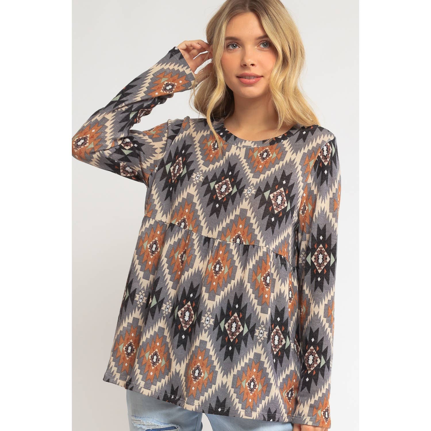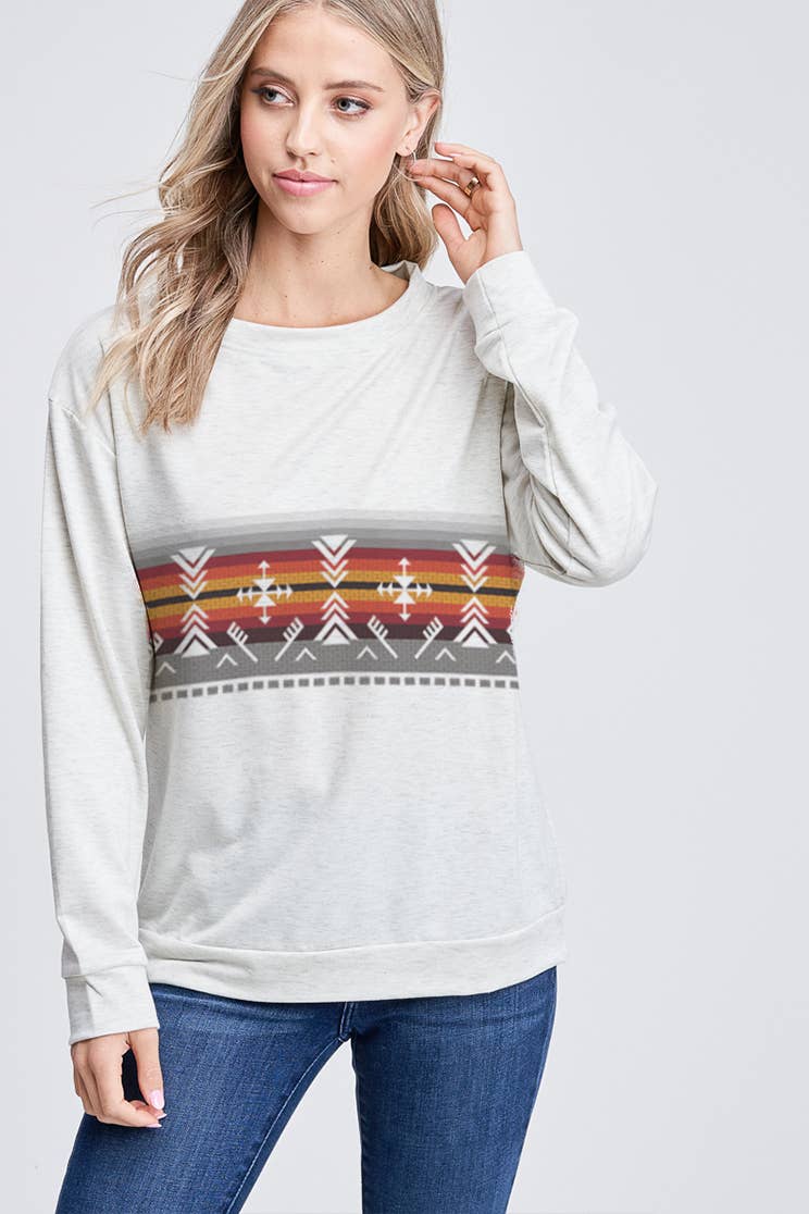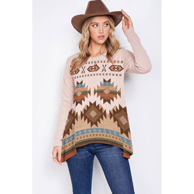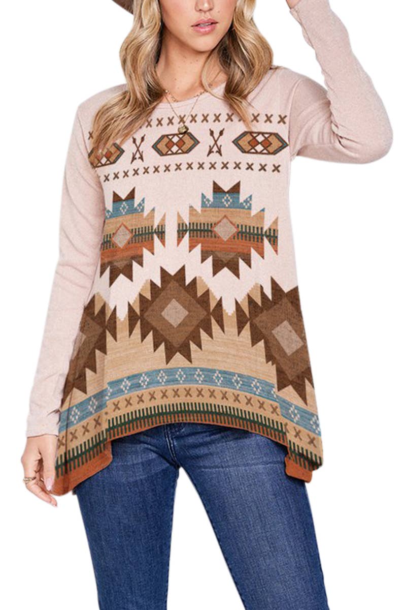 -Diamond Aztec long sleeve top -Soft fabric, casual style, very day wear. -Model size: Small ( 5'10" 31- 23- 34 ) -Made in USA