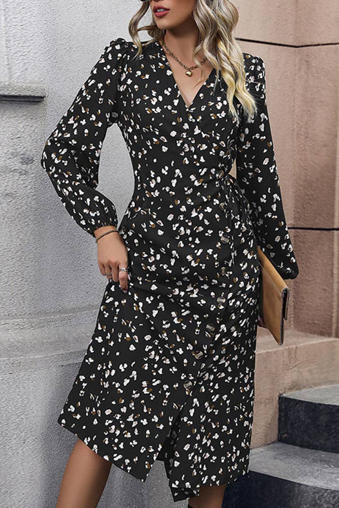 - Made in the USA - Printed Satin - V neck - Side Pockets - Mid calf length - Model is wearing size S
