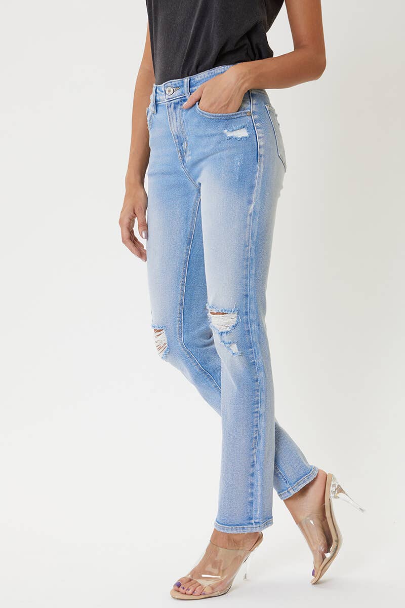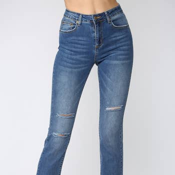 WHOLESALE DISTRESSED HEM DENIM PANTS W/RIPPED KNEES(H9616-DENIM BLUE)