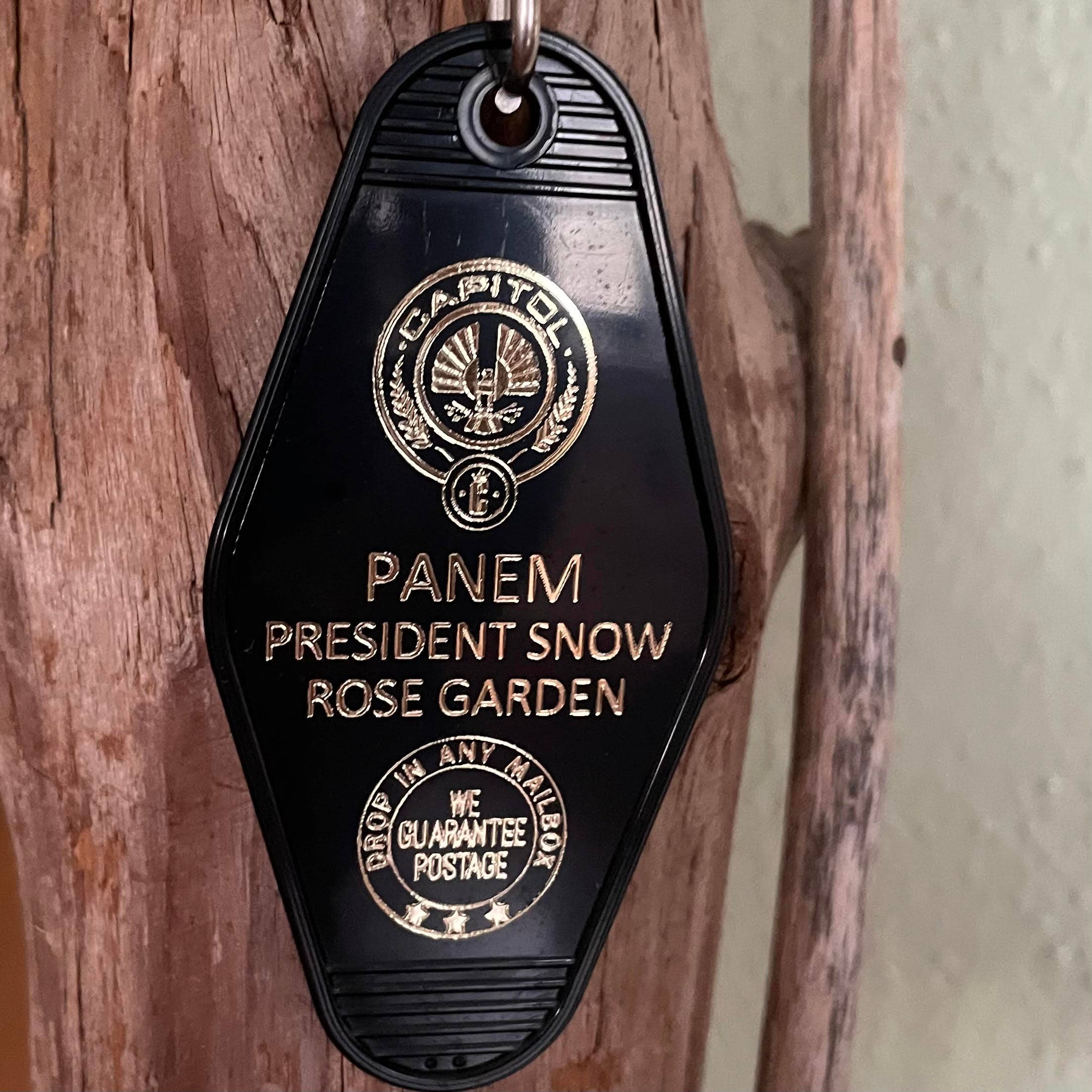 Vintage style motel key fob, complete with 32 mm slip ring, featuring the resistance, Hunger Games.
